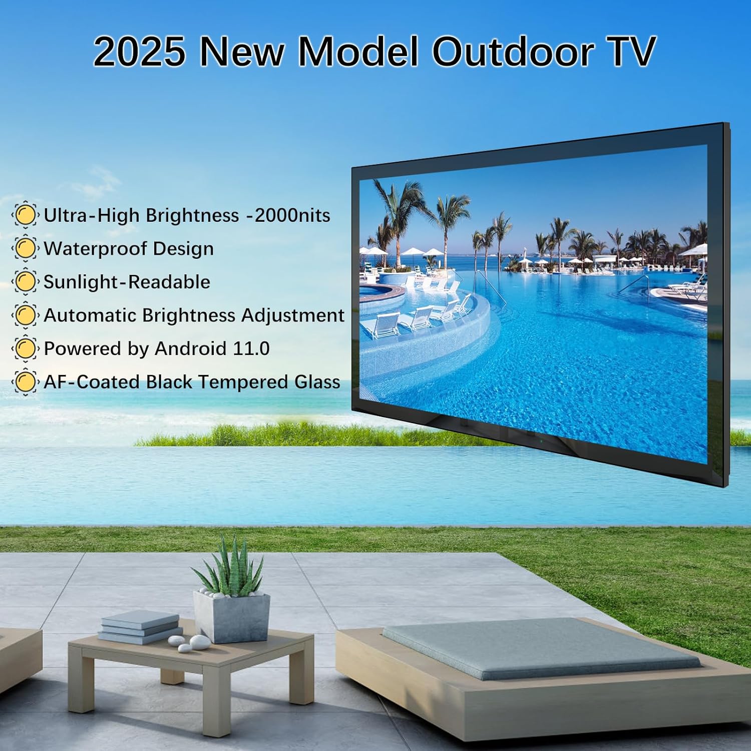تلفزيون اندرويد ذكي مدمج – قم بتثبيت يوتيوب ونتفليكس مسبقًا (قم بتحميل المزيد من التطبيقات من متجر تطبيقات التلفزيون المدمج) لتسلية لا نهاية لها. . استمتع باتصال ذكي وواجهة بديهية، مصممة للاستخدام في الهواء الطلق.