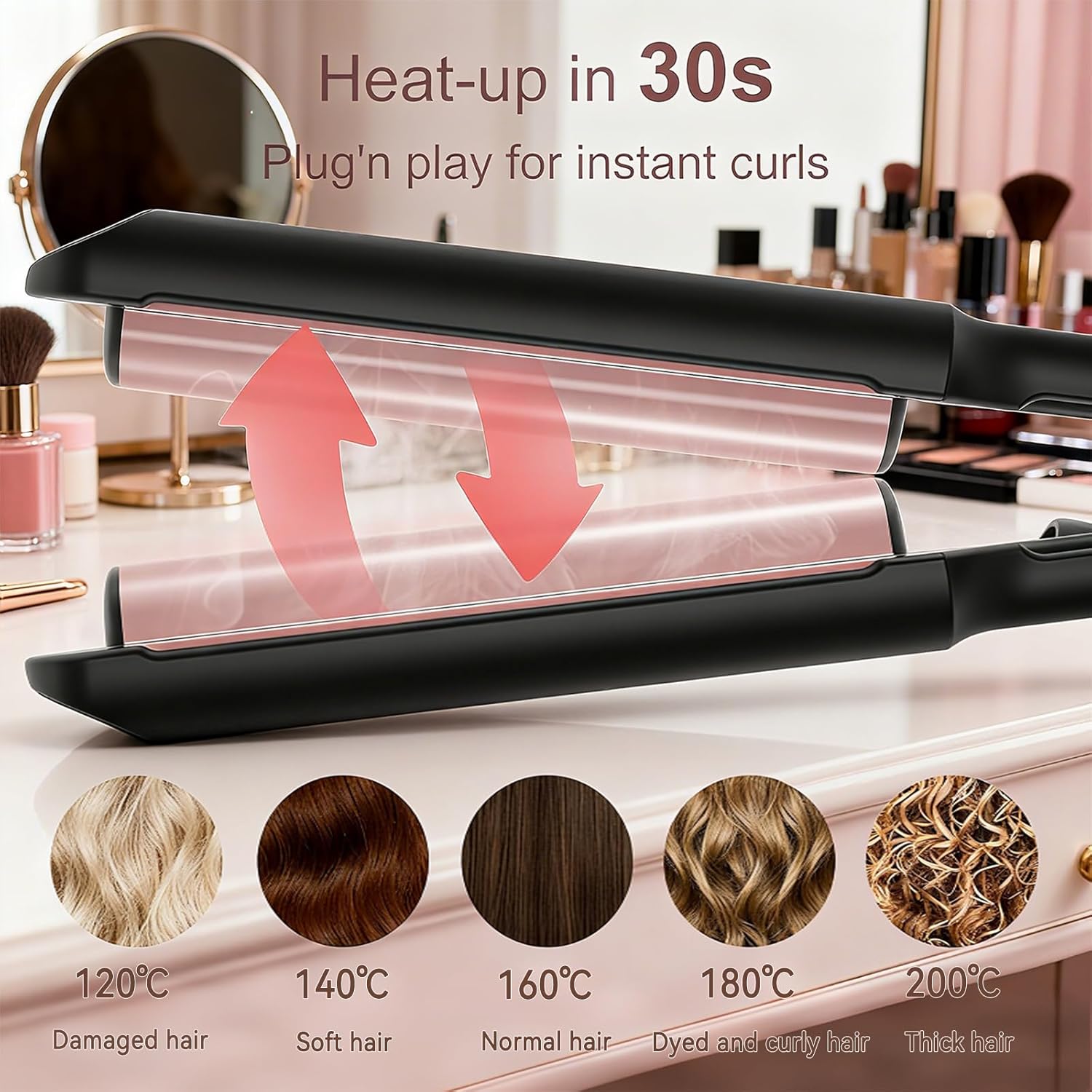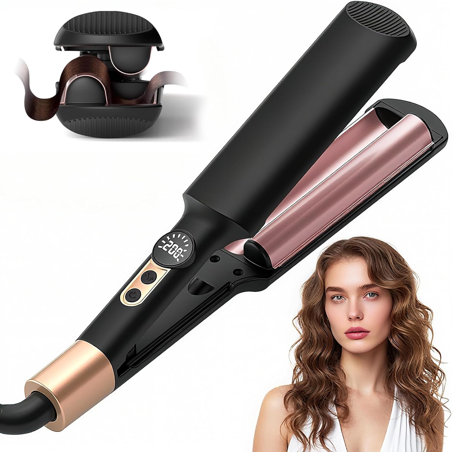 أداة شعر مموج تسخين سريع 30 ثانية وتجعيدها بنقرة واحدة: أداة تجعيد الشعر باستخدام تقنية التسخين بمعامل معامل درجة الحرارة، تسخن إلى درجة الحرارة المثالية في 30 ثانية فقط، مما يسمح لك ببدء التصفيف دون انتظار. تمويج الشعر للشعر القصير، فقط اضغطي بلطف لمدة 8-10 ثوانٍ لتثبيته وتصفيفه في 3-5 دقائق. حتى للمبتدئين الذين يستخدمون أو مكواة تجعيد الشعر الصباحية المزدحمة تجعل من السهل صنع شعر مموج طبيعي وناعم.