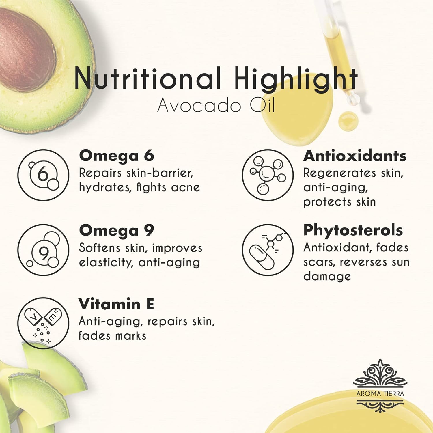 اروما تييرا زيت افوكادو نقي 100% وعضوي ومعصور على البارد وغير مكرر وبكر – لنمو الشعر والوجه والبشرة الجافة والجسم والهالات السوداء – 30 مل