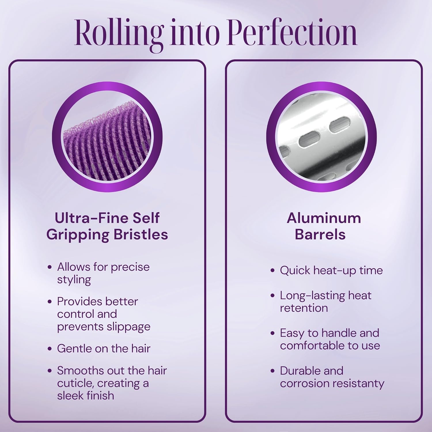 بكرات شعر ذاتية الإمساك: على عكس البكرات الأخرى التي يمكن أن تسبب تساقط الشعر وتجعده، تتميز بكرات الحرارة الخاصة بنا بتصميم لطيف يشبه الفيلكرو يمسك بالخيوط بأمان دون شد أو تلف. اقضِ وقتًا أقل في القلق بشأن شعرك ووقتًا أطول في الاستمتاع بتجعيدات خالية من العيوب وخالية من التجعد تبقى ثابتة.