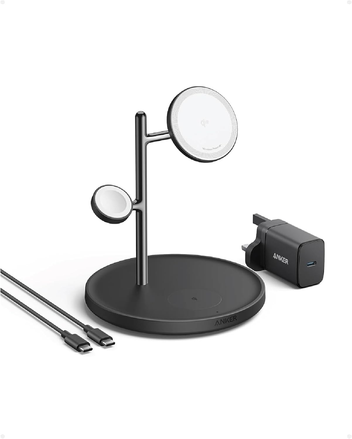 انكر قاعدة شحن لاسلكية 3 في 1، متوافقة مع شاحن ماج سيف، حامل لاسلكي 15 واط معتمد من كيو اي 2، لايفون 17/16، ايربودز برو، ابل ووتش الترا (شاحن USB C وكابل متضمن)