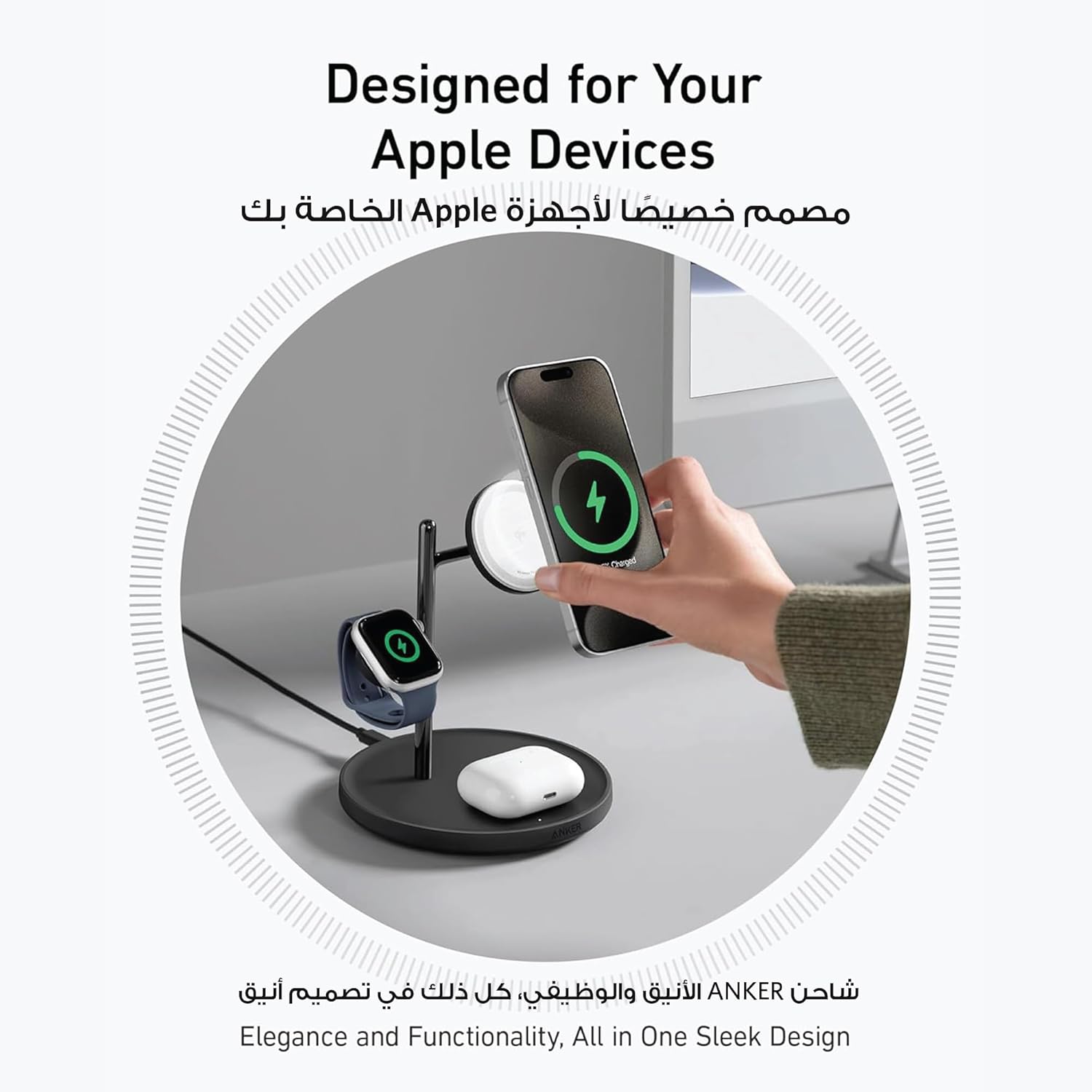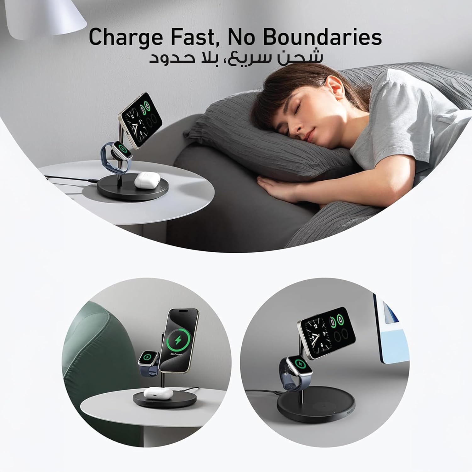 شحن جمالي متعدد الأجهزة: استمتع بتصميم مبهج من الناحية الجمالية والمسافات الدقيقة مع هيكل مبتكر “يشبه الشجرة”، مما يسمح بالشحن المتزامن السلس لجهاز ايفون وساعة ابل وايربودز.