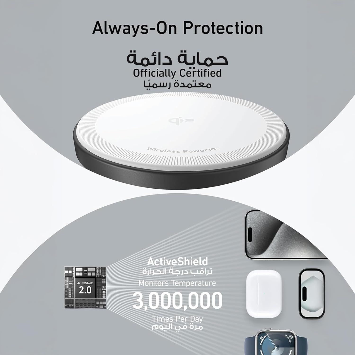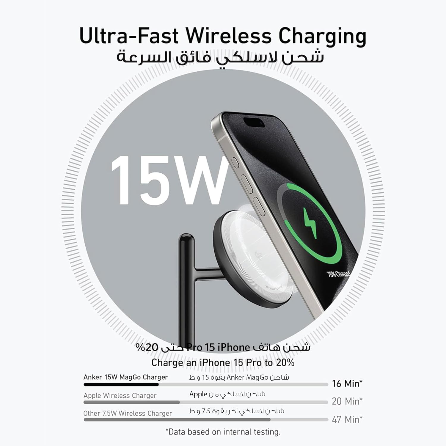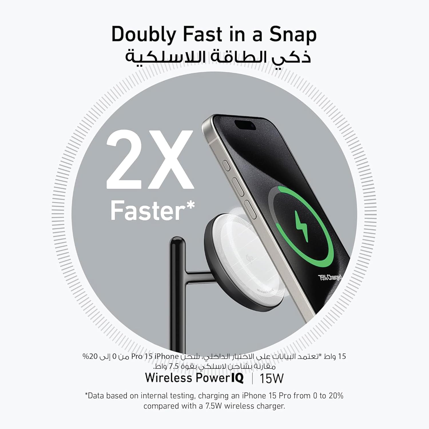 شحن فائق السرعة 15 واط: انغمس في تجربة شحن فائقة مع طاقة 15 واط، مضمونة بشهادة كيو اي 2 وتوافق ماج سيف لشحن سريع وآمن وفعال في كل مرة.