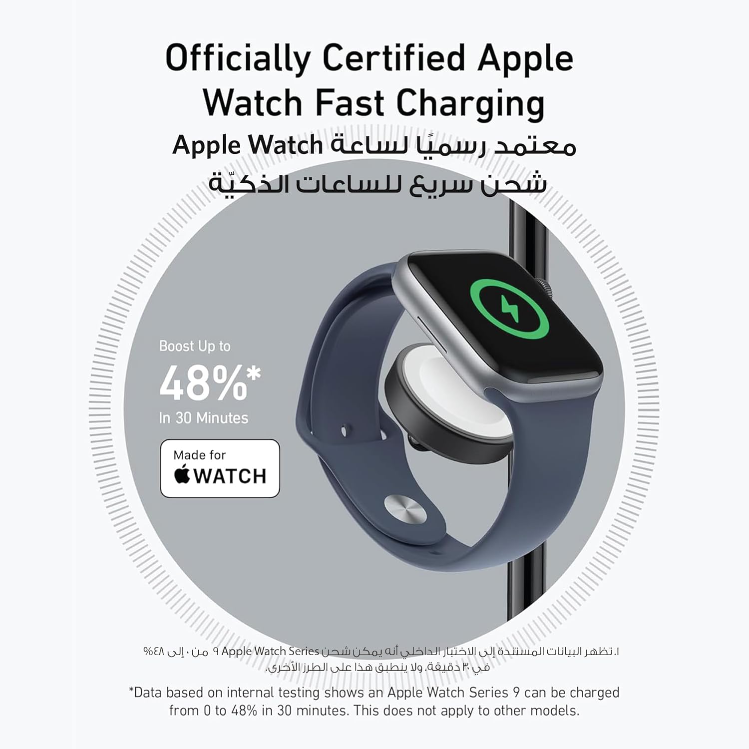 ميزة الشحن السريع: اشحن ساعة ابل سلسلة 9 إلى 48% في 30 دقيقة فقط بفضل شهادة ام اف دبليو. لا تقم فقط بتشغيل الطاقة؛ قم بذلك بشكل أسرع بكثير وحافظ على أجهزتك تعمل طوال الليل. (ملاحظة: للشحن الأمثل، استخدم شاحن الحائط المزود بمنفذ USB-C PD بقدرة 40 واط.)