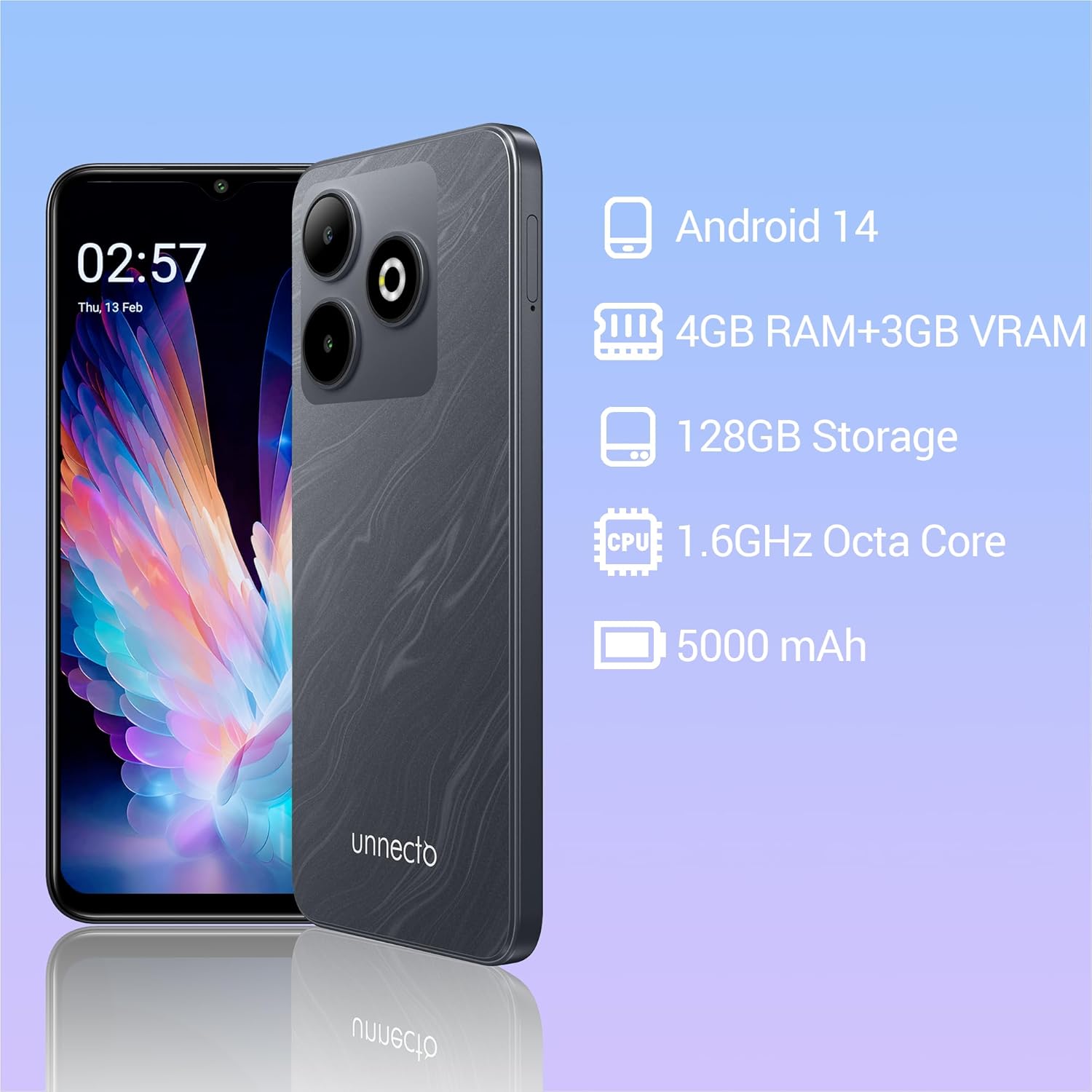 اننيكتو بولت 10 | ثنائي شرائح الاتصال | هاتف ذكي غير مقفل | اندرويد 14 | بطارية يومين | ان اف سي | شاشة 6.55 انش HD+ | 4GB + 8GB VRAM | تخزين 128GB | كاميرا مزدوجة 16MP | بصمة الاصبع | فحمي