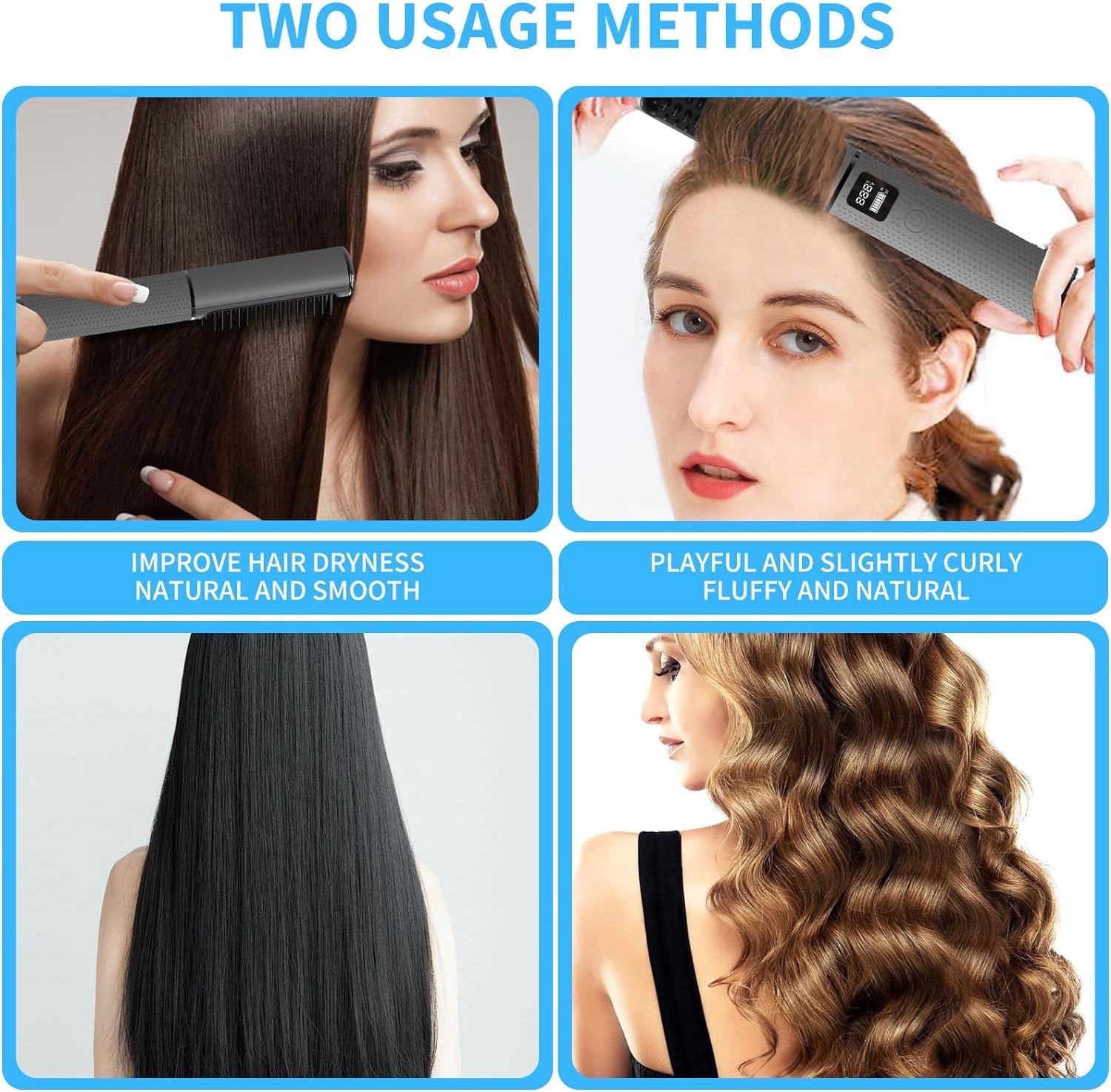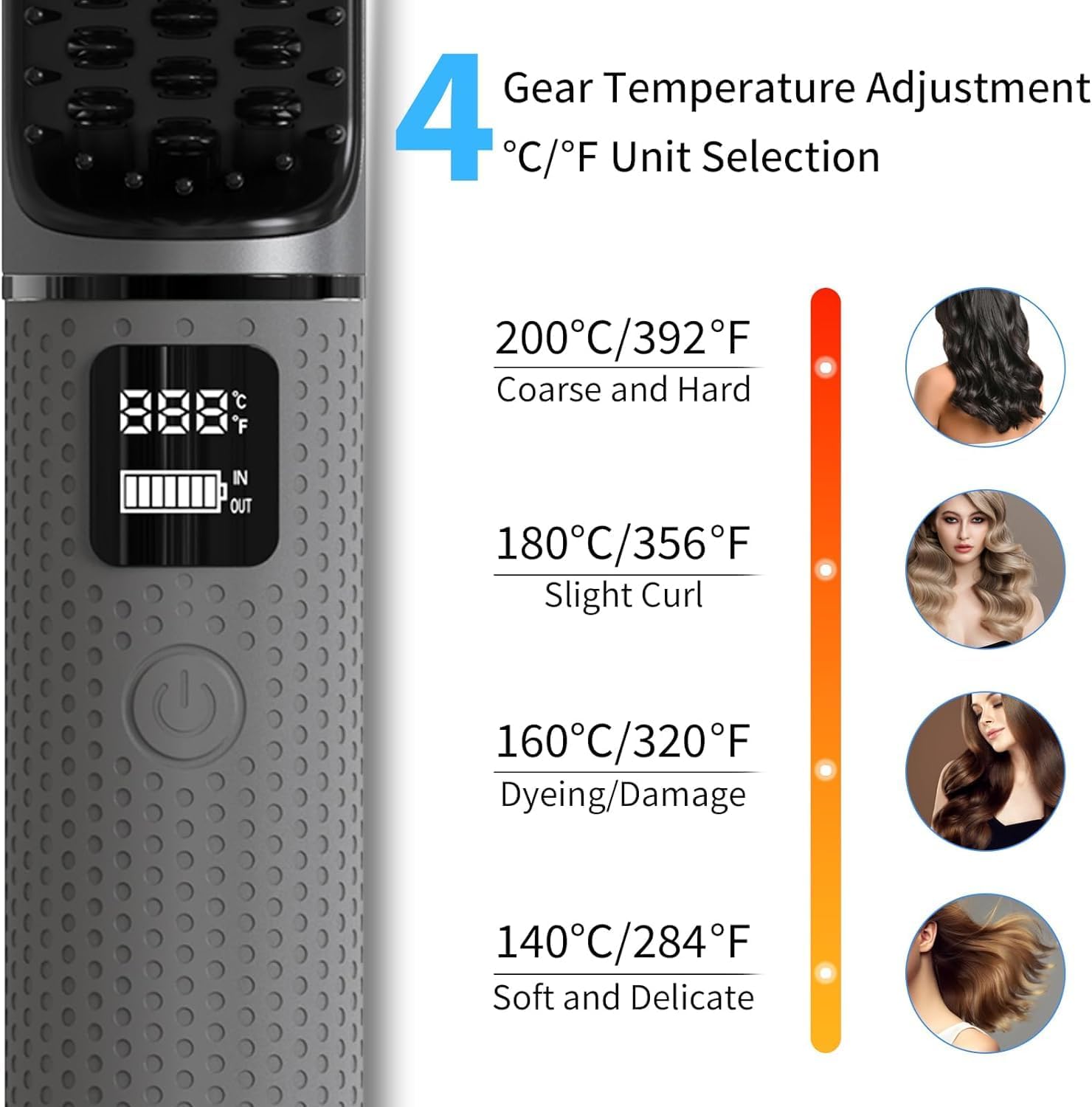 【4 إعدادات لدرجة الحرارة】: تأتي فرشاة فرد الشعر مع أربعة إعدادات للحرارة: 200 درجة مئوية/482 درجة فهرنهايت للشعر القوي/الكثيف؛ 180 درجة مئوية/356 درجة فهرنهايت للشعر العادي/المنسوج؛ 160 درجة مئوية/320 درجة فهرنهايت للشعر الرقيق/الناعم؛ 140 درجة مئوية/340 درجة فهرنهايت للشعر الناعم/الناعم. عرض LED يسمح لك تحكم بدقة في درجة الحرارة وفهم عملية التسخين بوضوح.