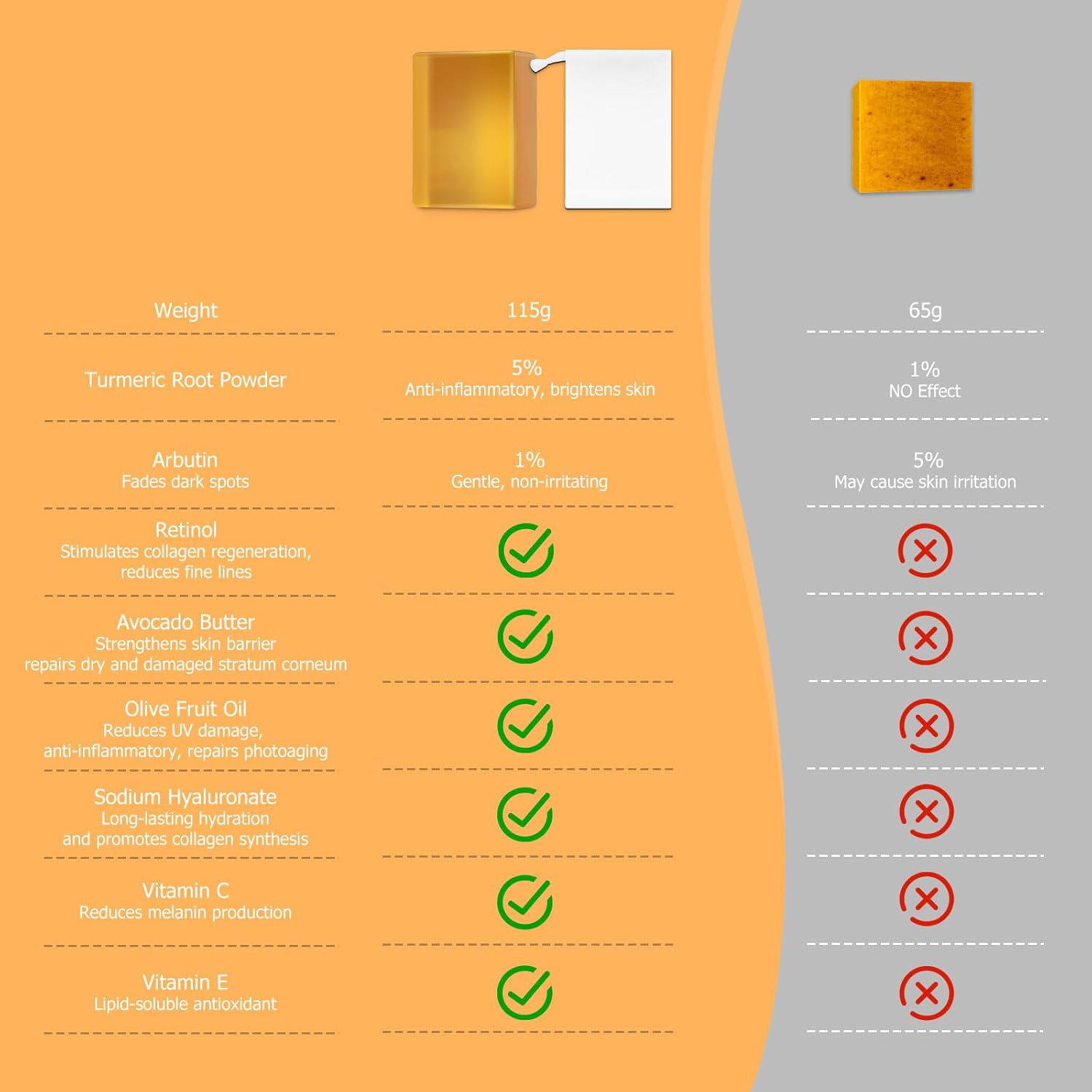 مزيج فعال: صابون الكركم الخاص بنا غني أيضًا بفيتامين سي والريتينول وحمض الهيالورونيك، وهذا يمكن أن يحافظ على بشرتك رطبة بشكل فعال من الداخل، ويقلل من أضرار أشعة الشمس والبقع الداكنة والعيوب للحصول على بشرة ناعمة ومشرقة.