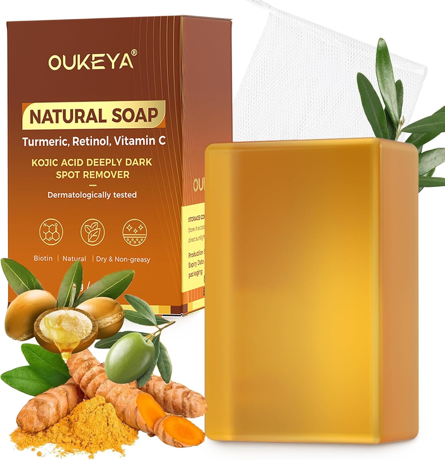 مكونات نباتية طبيعية: تم تركيب صابون الكركم الخاص بنا لتجديد وتقشير وتغذية المناطق ذات البقع الداكنة. غني بحمض الهيالورونيك وفيتامين E وزبدة الشيا وزيت الزيتون القشتالي، يتغلغل بعمق وينشط بشرتك.