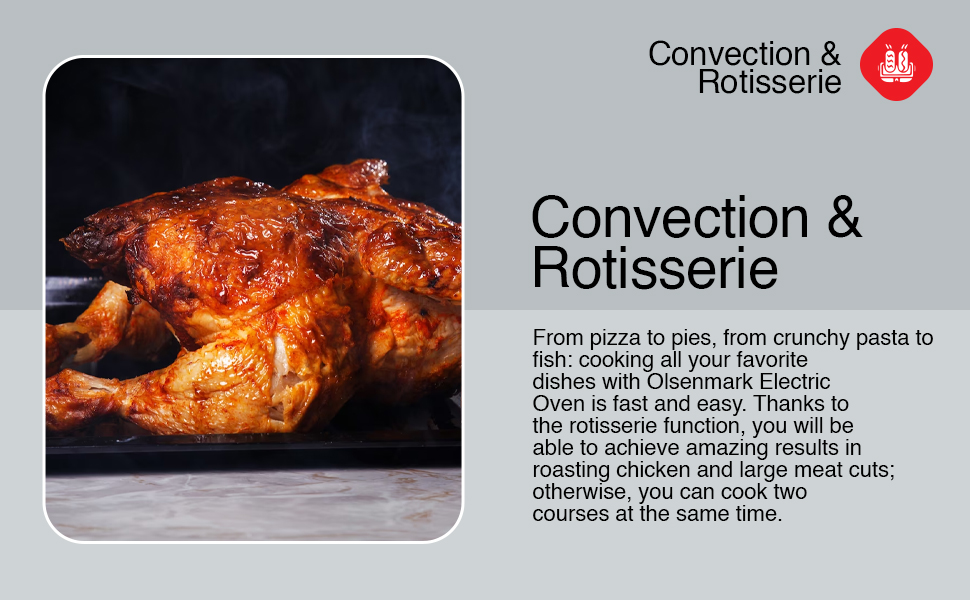 شواية – من البيتزا إلى الفطائر ومن المعكرونة المقرمشة إلى الأسماك: يعد طهي جميع الأطباق المفضلة لديك باستخدام فرن اولسين مارك الكهربائي سريعًا وسهلاً. بفضل وظيفة المشواة، ستتمكن من تحقيق نتائج مذهلة في تحميص الدجاج وقطع اللحم الكبيرة؛ وإلا يمكنك طهي دورتين في نفس الوقت.