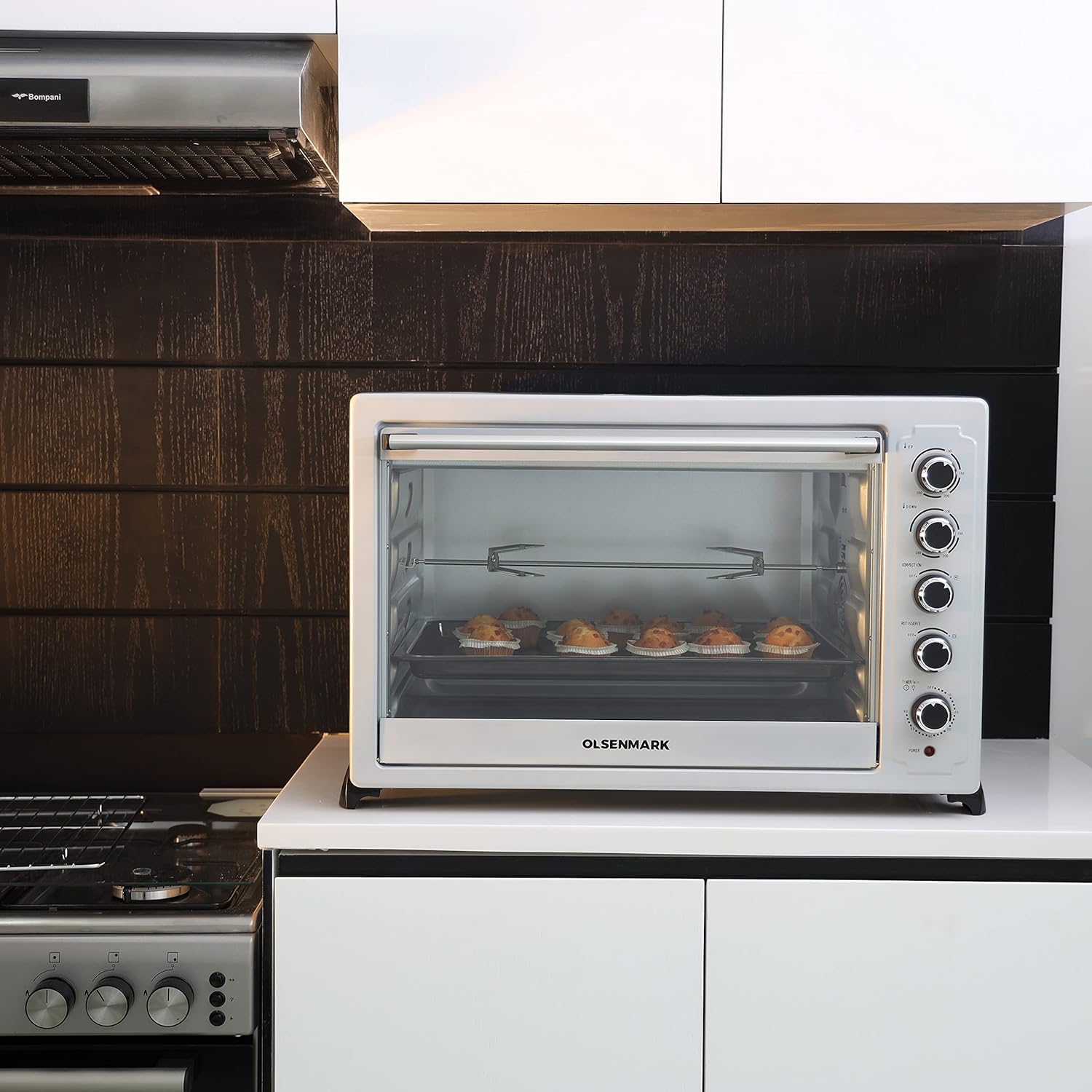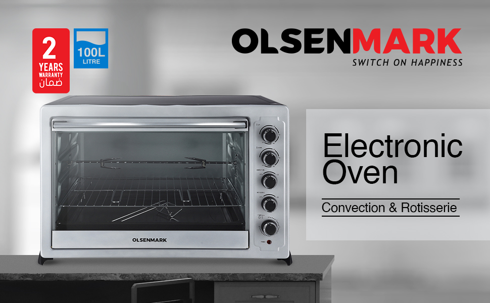 اولسين مارك فرن ومشواة 100 لتر – فرن كهربائي 2800 واط – درجة حرارة قابلة للتعديل 100-250، وظيفة مؤقت 60 دقيقة – وظائف طهي متعددة وشواية – الملحقات متضمنة – ضمان لمدة عامين