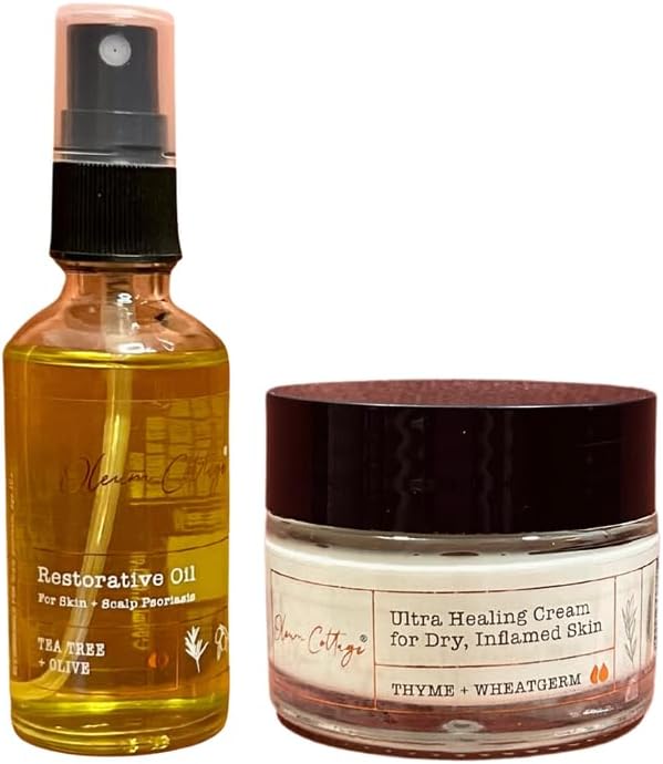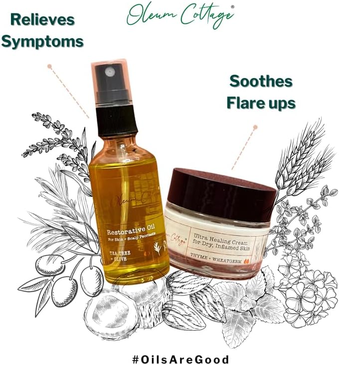 نقدم لك حزمة العناية بالبشرة من اوليومك كوتيج لبقع الصدفية والأكزيما والتهاب الجلد الصغيرة على الجسم والظهر والذراعين والساقين. تتكون الحزمة من زيت ترميم وكريم فائق الشفاء
