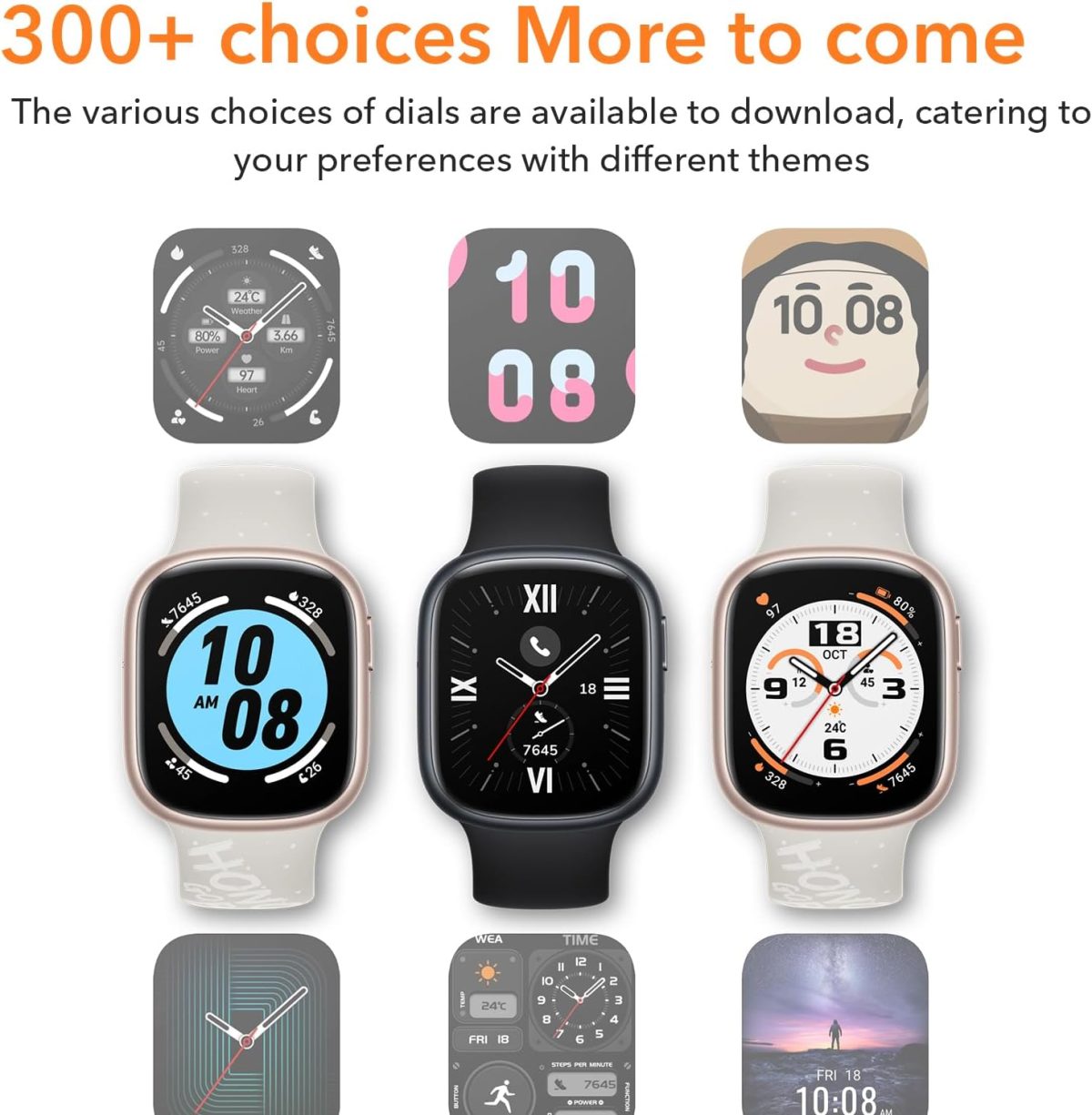 【شاشة اموليد 1.75 انش، أكثر من 300 قرص】تتميز ساعة اونر 4 بشاشة اموليد ملونة مقاس 1.75 انش مع معدل تحديث يصل إلى 60 هرتز ودقة 390 × 450. تتوفر الخيارات المختلفة لأكثر من 300 قرص للتنزيل، لتلبية تفضيلاتك بموضوعات مختلفة.