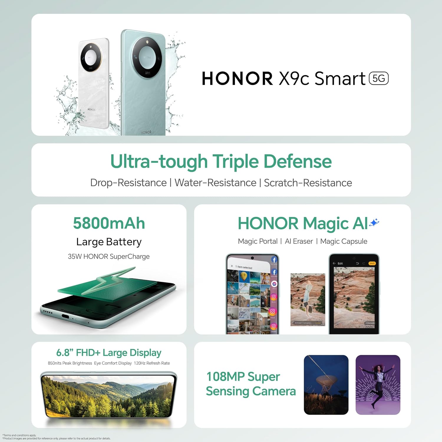 هيكل متين وموثوق: تم تصميم جهاز اونر X9c SMART 5G لمقاومة المياه والغبار بدرجة IP65 وحماية ضد السقوط ومقاومة للحرارة وزجاج مقوى معتمد من SGS، تم تصميم اونر X9c SMART 5G ليتحمل مغامراتك الأكثر صعوبة.