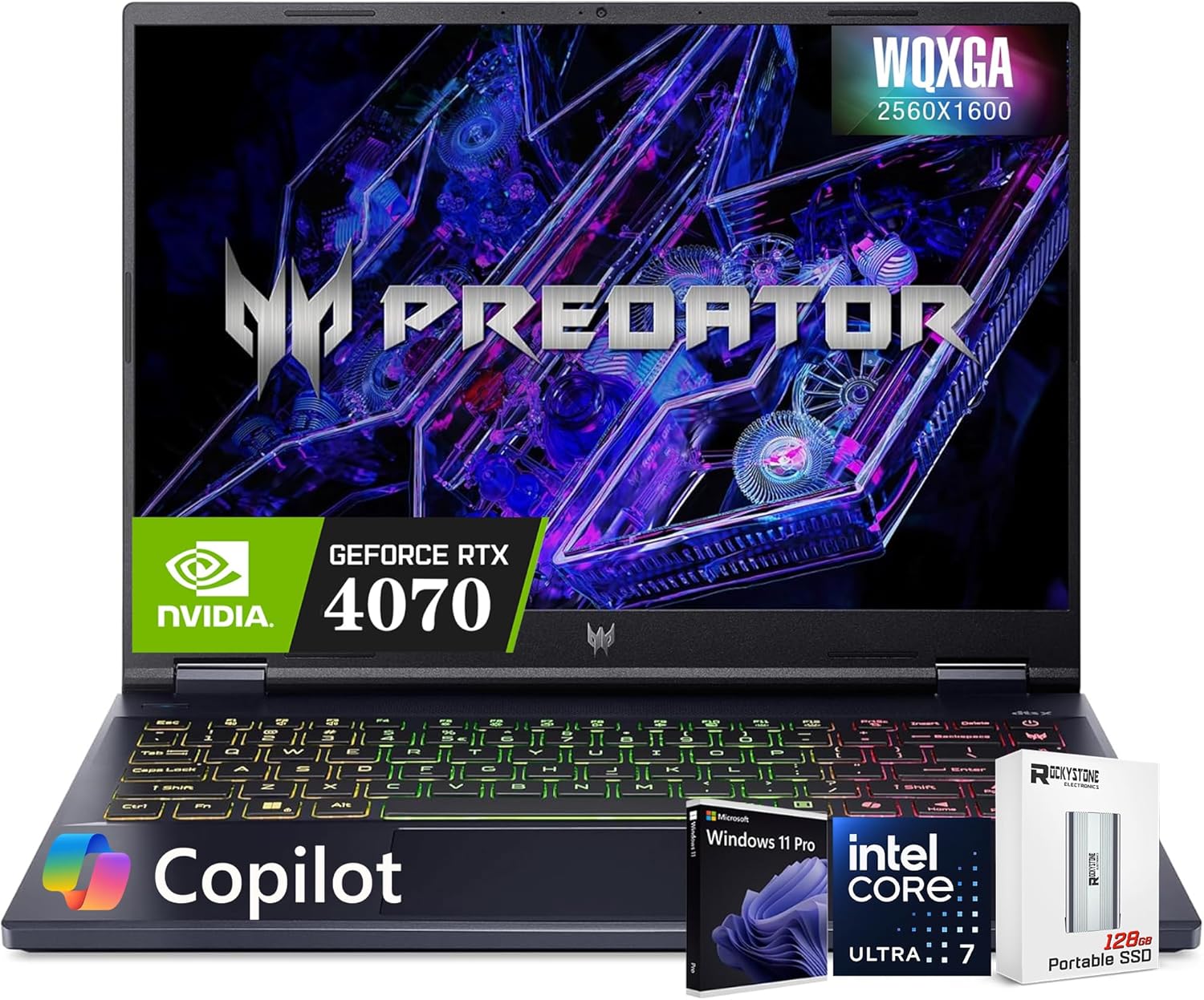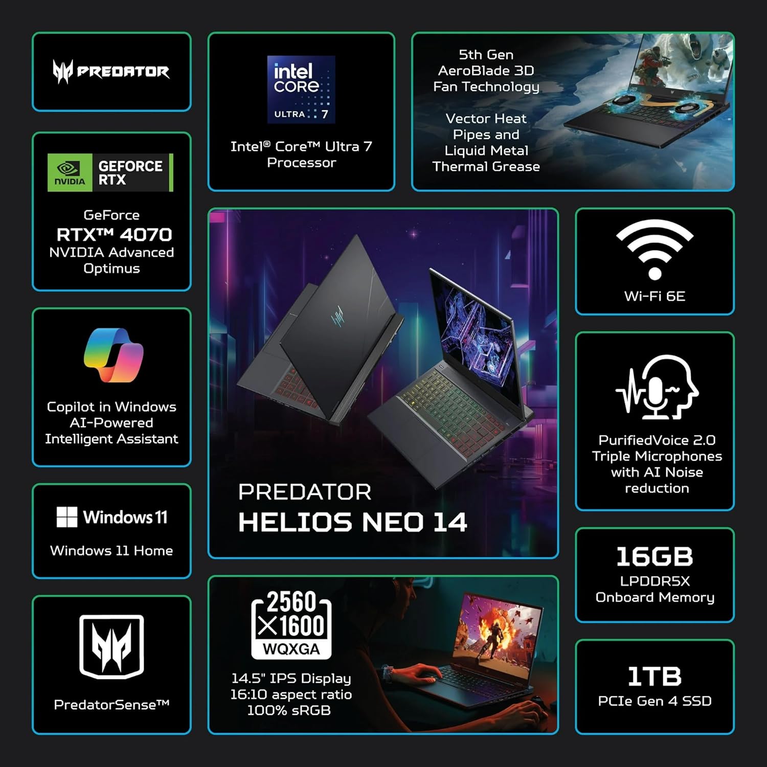 ايسر لابتوب بريداتور هيليوس نيو 14 للالعاب بتقنية الذكاء الاصطناعي، بطاقة عرض مرئي جيفورس RTX 4070، شاشة 14.5 انش WQXGA (2560×1600، 100% sRGB، جي-سينك)، انتل 16 كور الترا 7 155H، اضاءة خلفية RGB