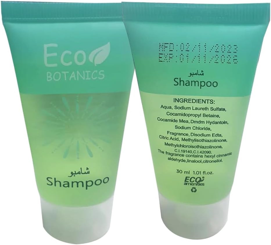 ايكو بوتانيكس شامبو مستلزمات العناية بالفنادق بحجم مناسب للسفر، مغلف بشكل فردي في أنبوب أبيض 30 مل، مع زيت عطري نقي خالٍ من البارابين والسيليكون، مصنوع من مواد عضوية، بدون نكهات صناعية أو ألوان أو مواد حافظة. عديم اللون وغير معطر وبدون تحفيز.