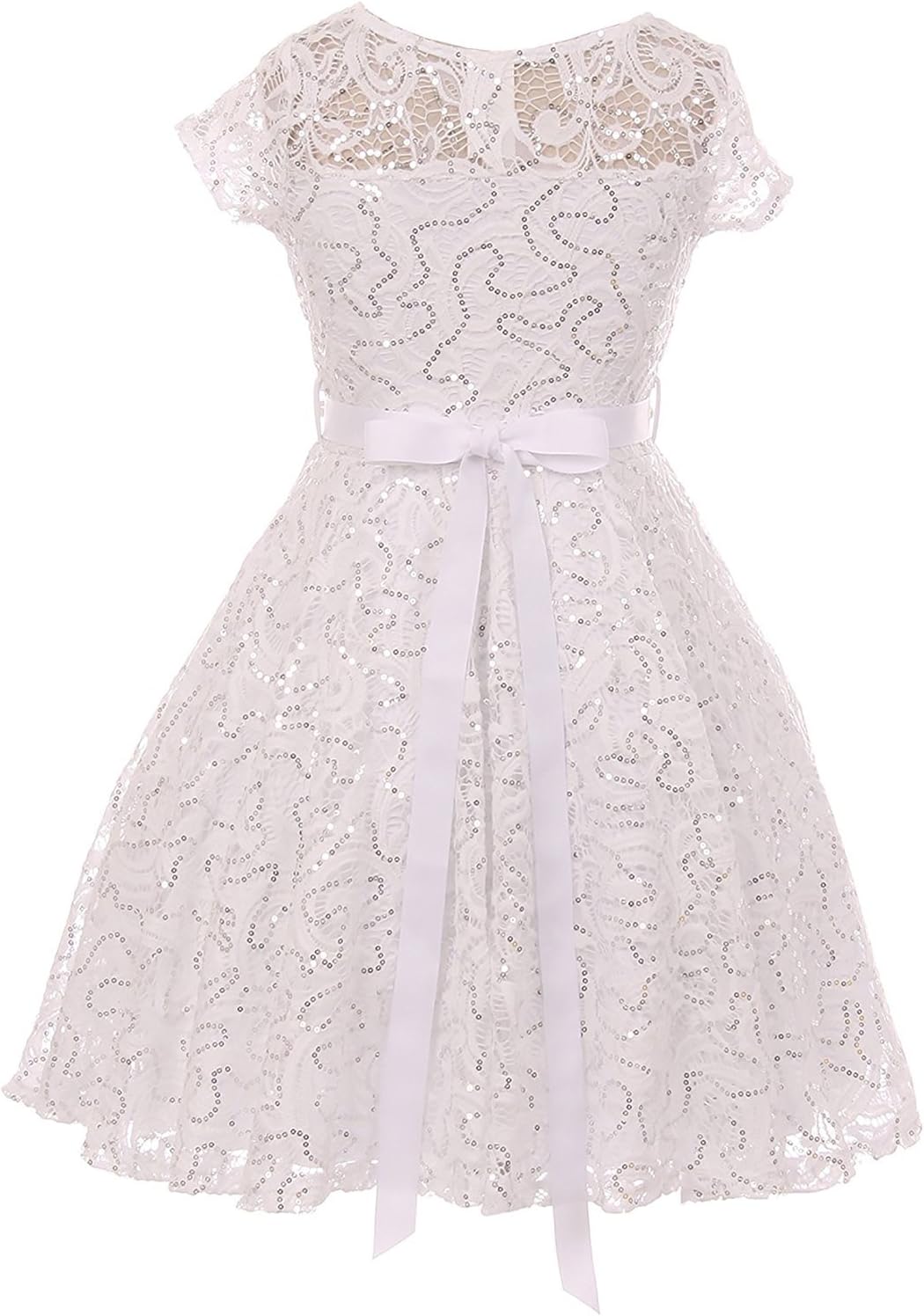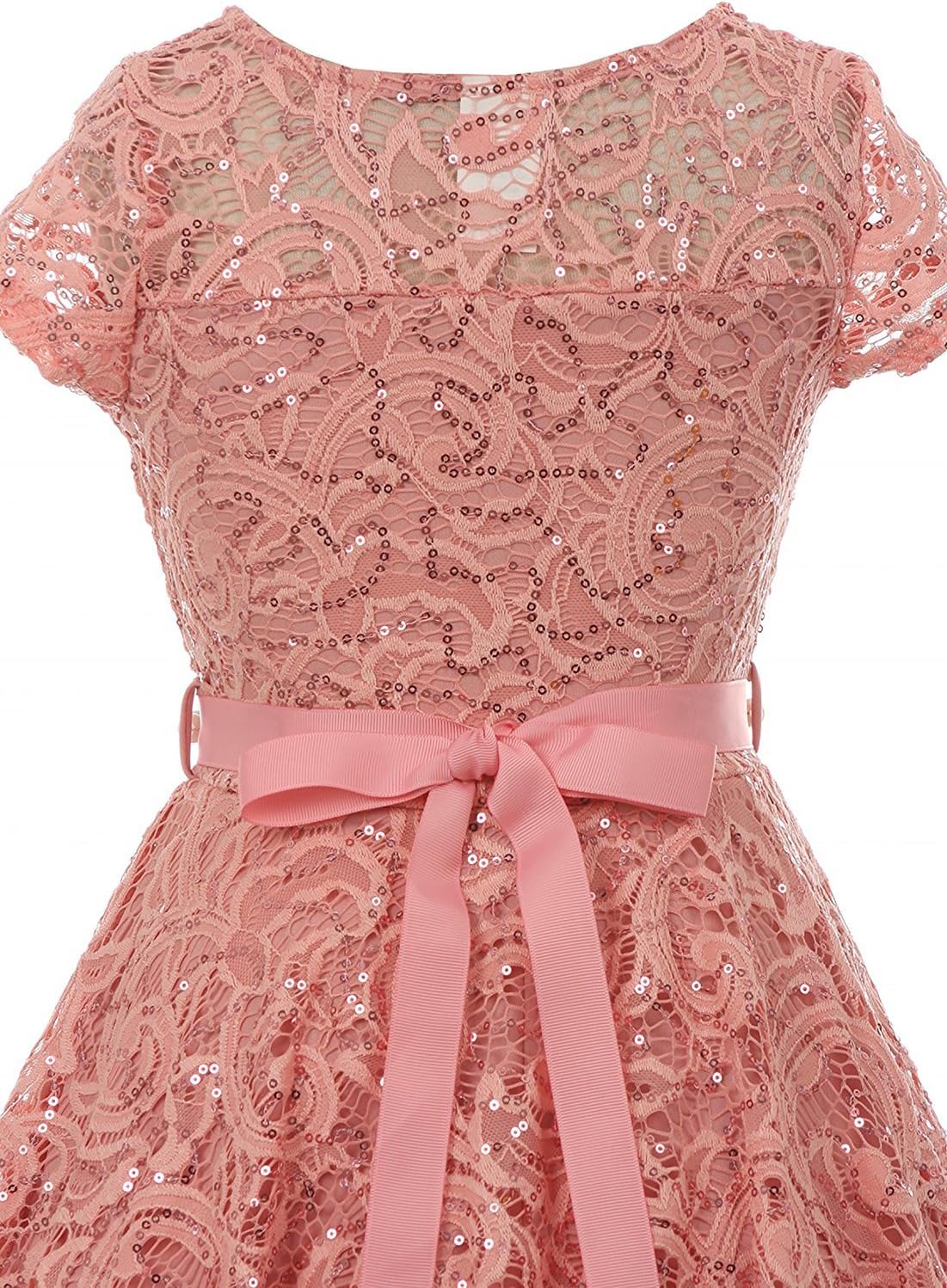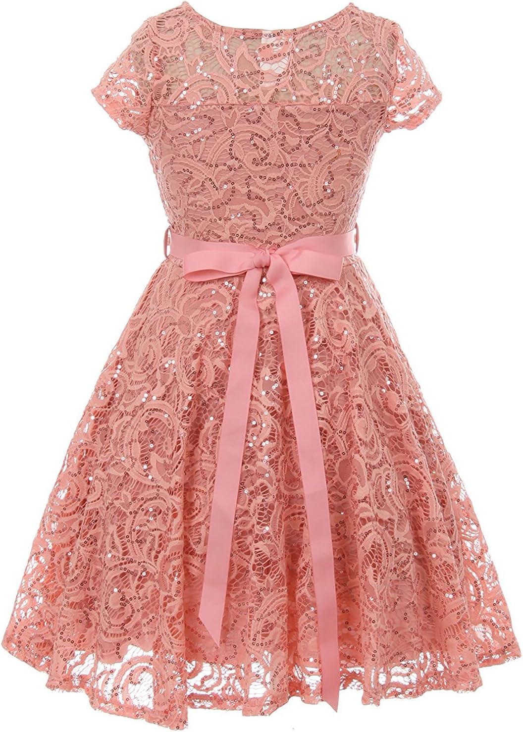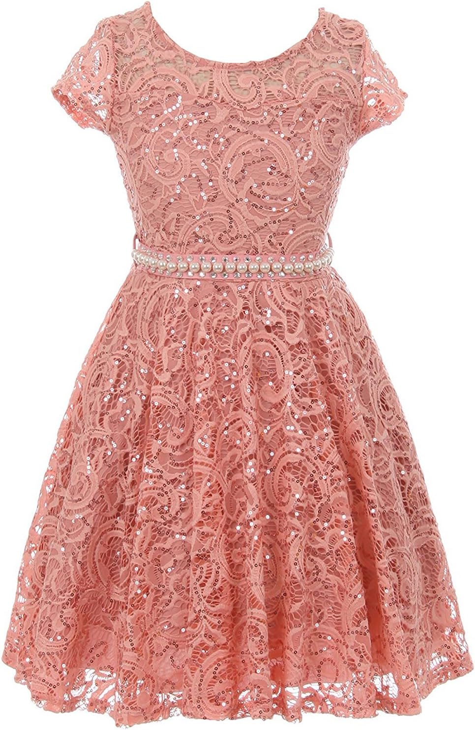 اي غيرل دريس فستان للفتيات الصغيرات والكبيرات بأكمام قصيرة من الدانتيل مزين بالترتر وحزام لؤلؤي مزين بالزهور بمقاسات 4-14، هذا الفستان مثالي لفستان فتاة الزهور وفستان عيد الفصح وفستان التخرج وفستان المناسبات الخاصة