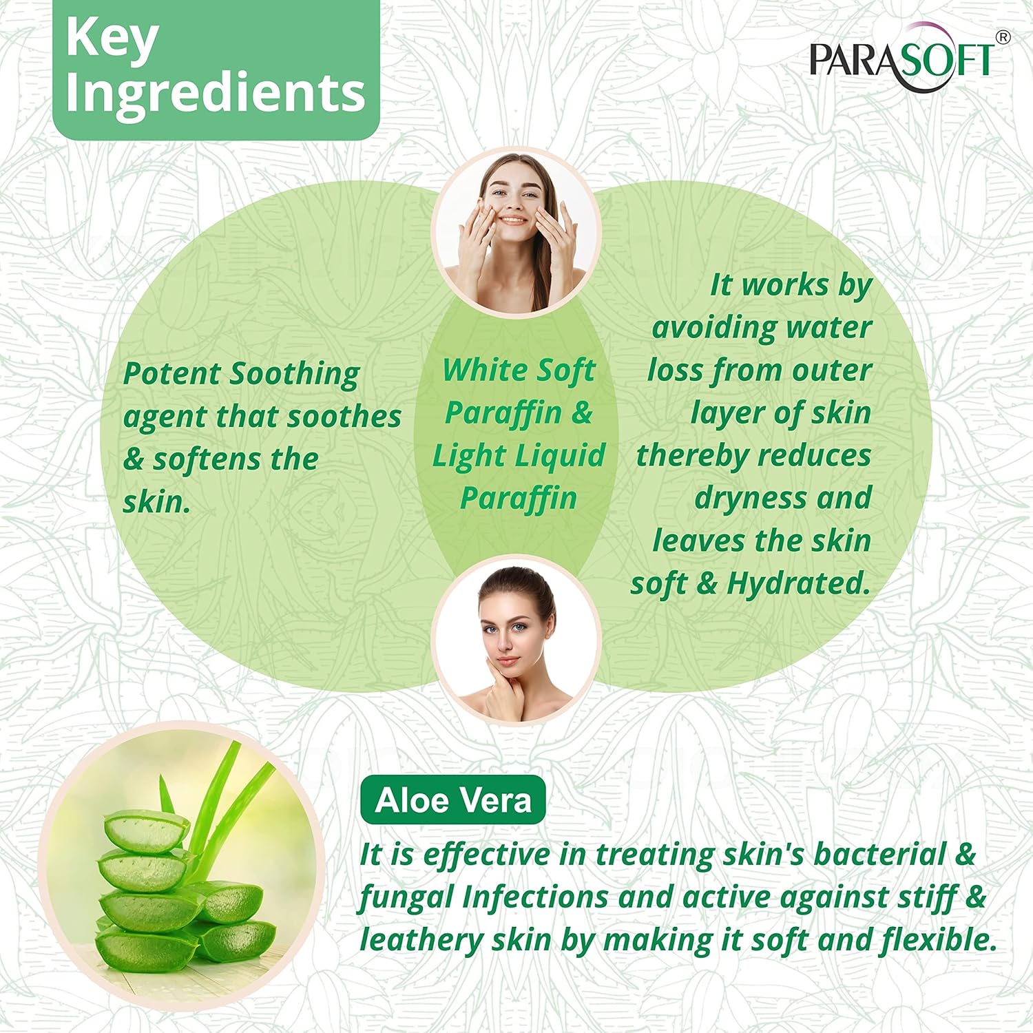 يوفر ترطيبًا مكثفًا: يحتوي المنتج على البارافين الأبيض الناعم والبارافين السائل الخفيف المضاف مع جودة الصبار الذي يوفر ترطيبًا مكثفًا وبالتالي يقلل من فقدان الماء مما يجعل البشرة ناعمة ونضرة ورطبة.