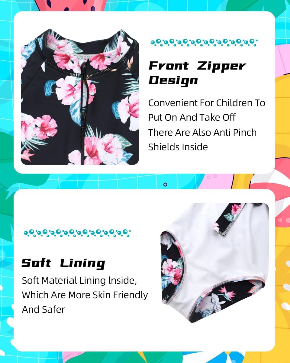 بدلة سباحة للبنات الصغيرات باكمام طويلة وسحاب من قطعة واحدة بعامل حماية من الاشعة فوق البنفسجية 50+ زهور نباتية استوائية للاعمار من 3-12 سنة