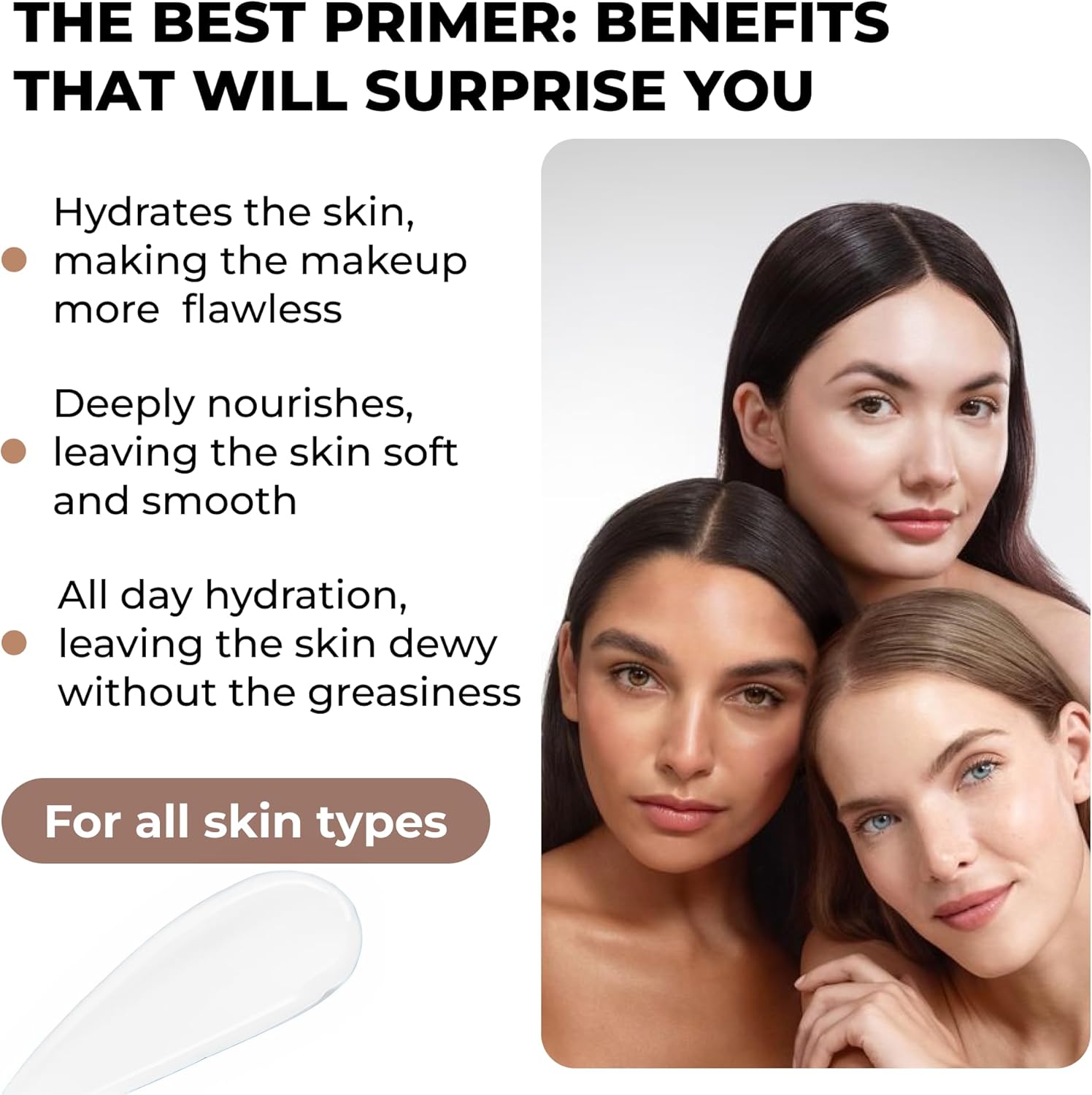 خالي من الزيوت وسريع الامتصاص: يمتص ملمس الجل غير الدهني في ثوانٍ، مما يخلق قاعدة ناعمة وخفيفة الوزن لكريم الأساس – لا يترك بقايا.