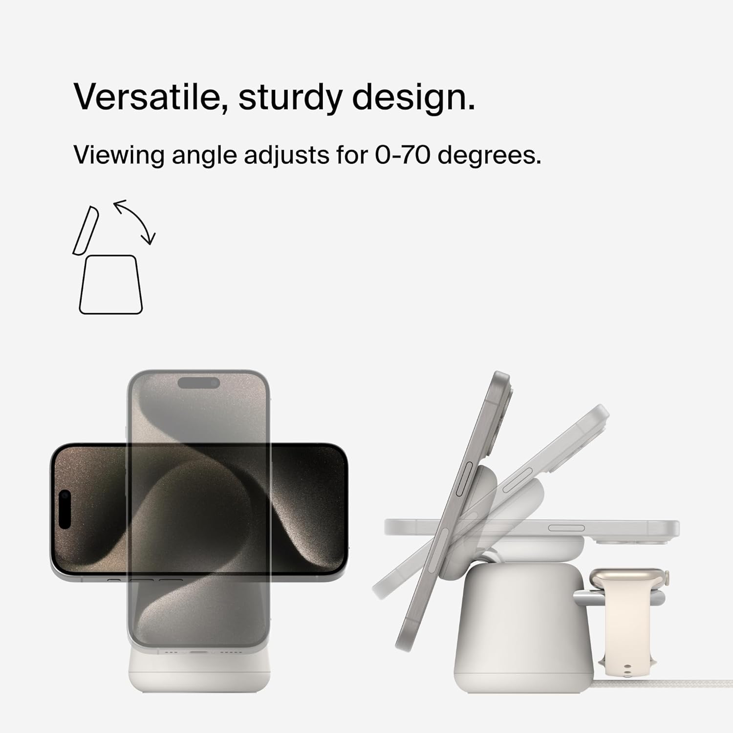 جاهزة للاستعداد: صمم جهاز ايفون الخاص بك كما تريد، حيث تدعم قاعدة الشحن بوست تشارج برو 2 في 1 وضع الاستعداد. سيبقى هاتفك في الوضع المثالي أثناء تحويله إلى ساعة بجانب السرير وإطار صور وشاشة عرض أدوات وأكثر من ذلك