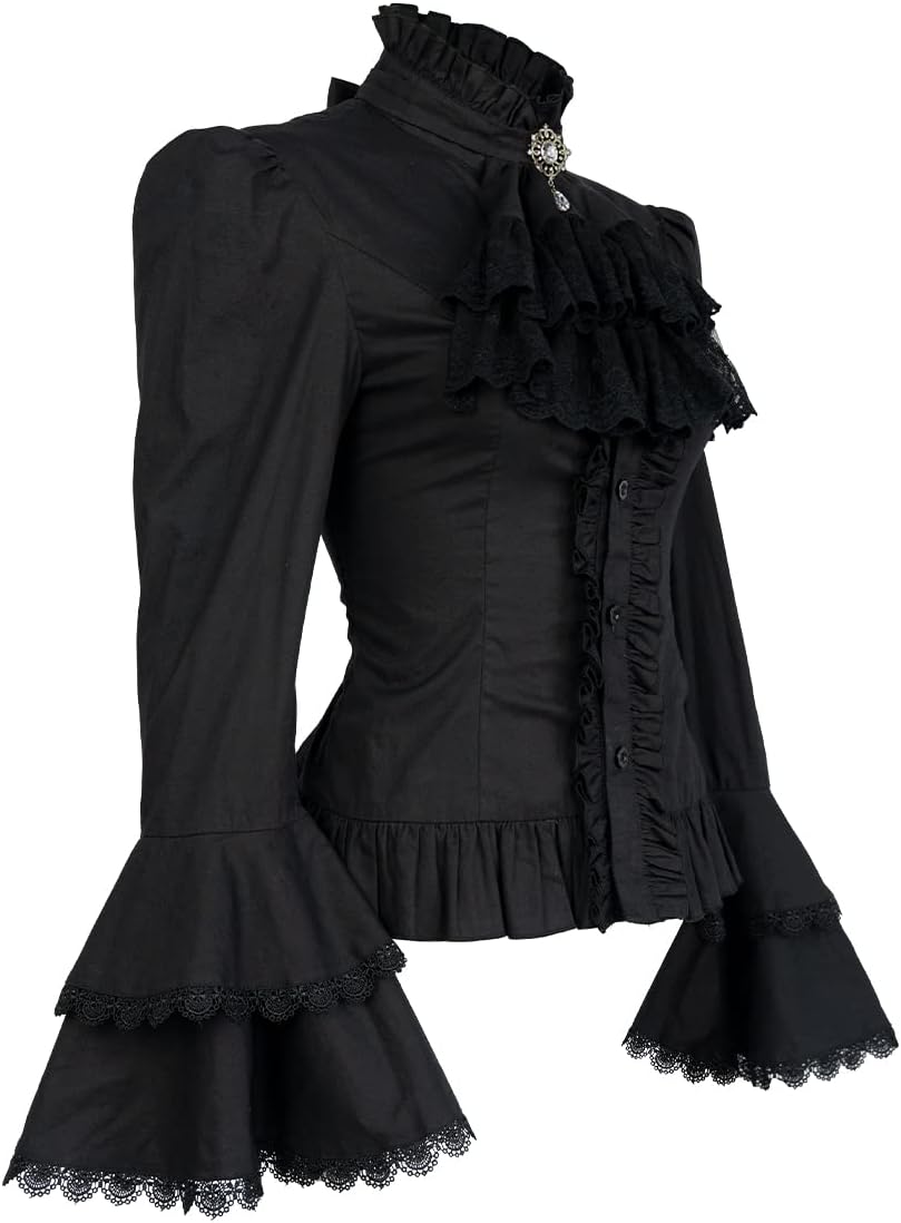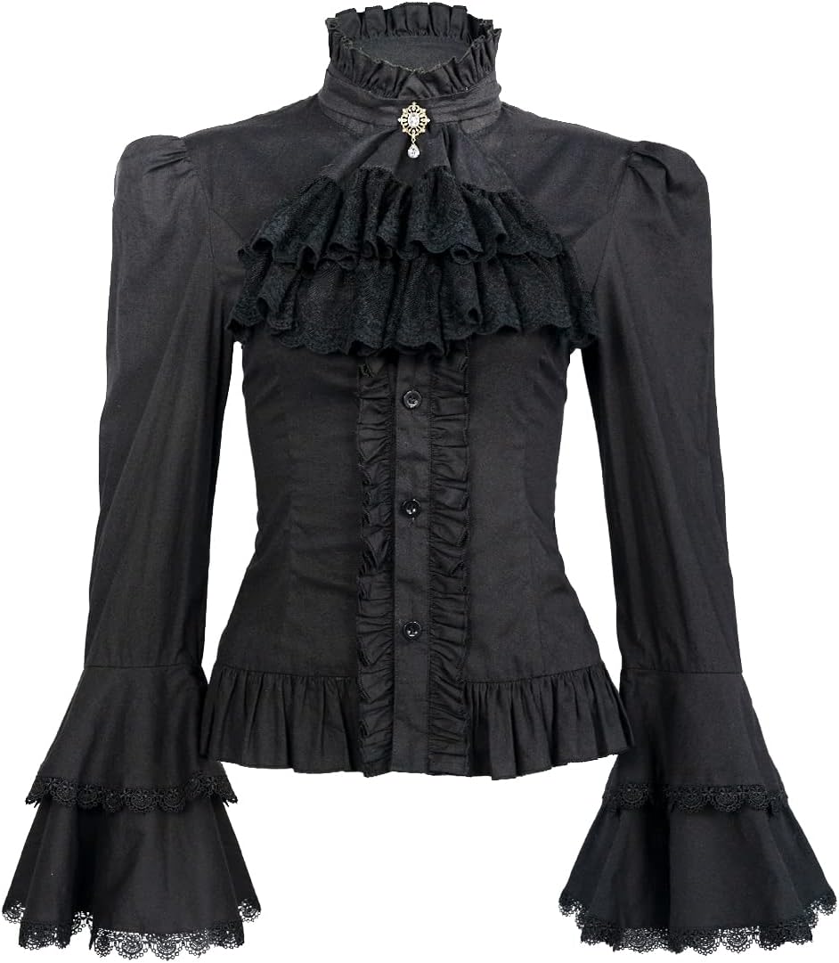 بلوزة فيكتوريان للنساء، قميص لوليتا قوطي عتيق بأكمام طويلة بلوزات مكشكشة لوتس