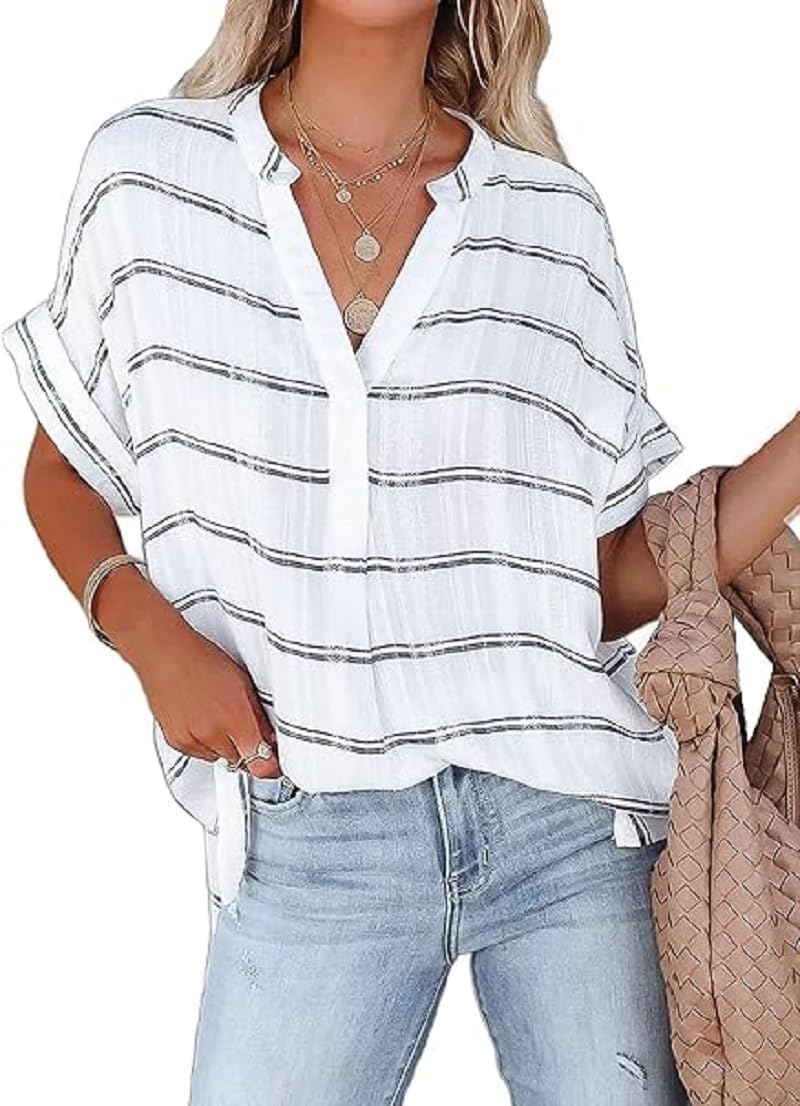 شراء بلوزة مخططة من الكتان باكمام قصيرة وقبة V للنساء اون لاين من امازون او نون وحراج بلوزة مخططة من الكتان باكمام قصيرة وقبة V للنساء