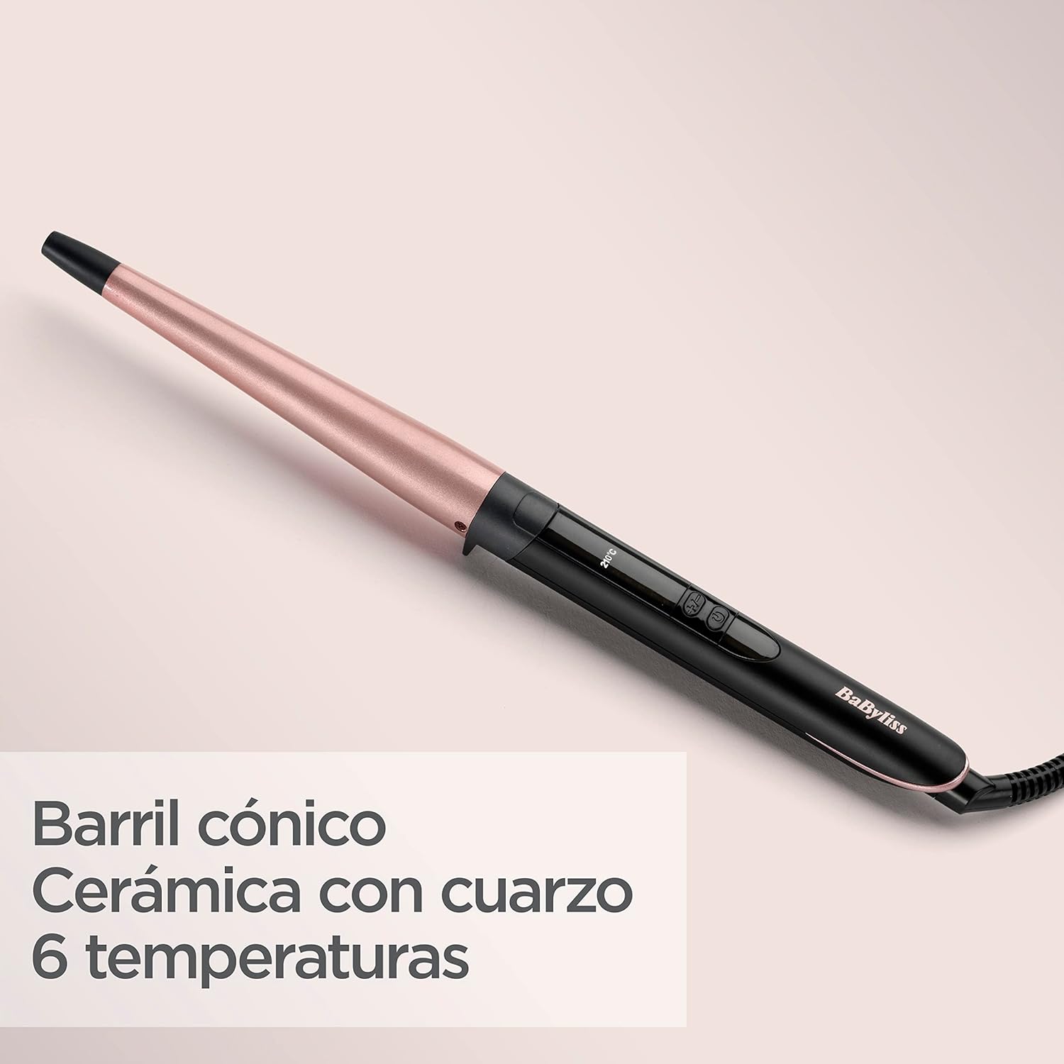 بيبي ليس عصا تجعيد الشعر المخروطية موديل C454E المزايا: مكواة مخروطية الشكل 13-25 ملم. سلك دوار بطول 2.5 متر. مكواة طويلة جدًا. درجة الحرارة 6 درجات حرارة رقمية (160 درجة مئوية – 210 درجة مئوية)