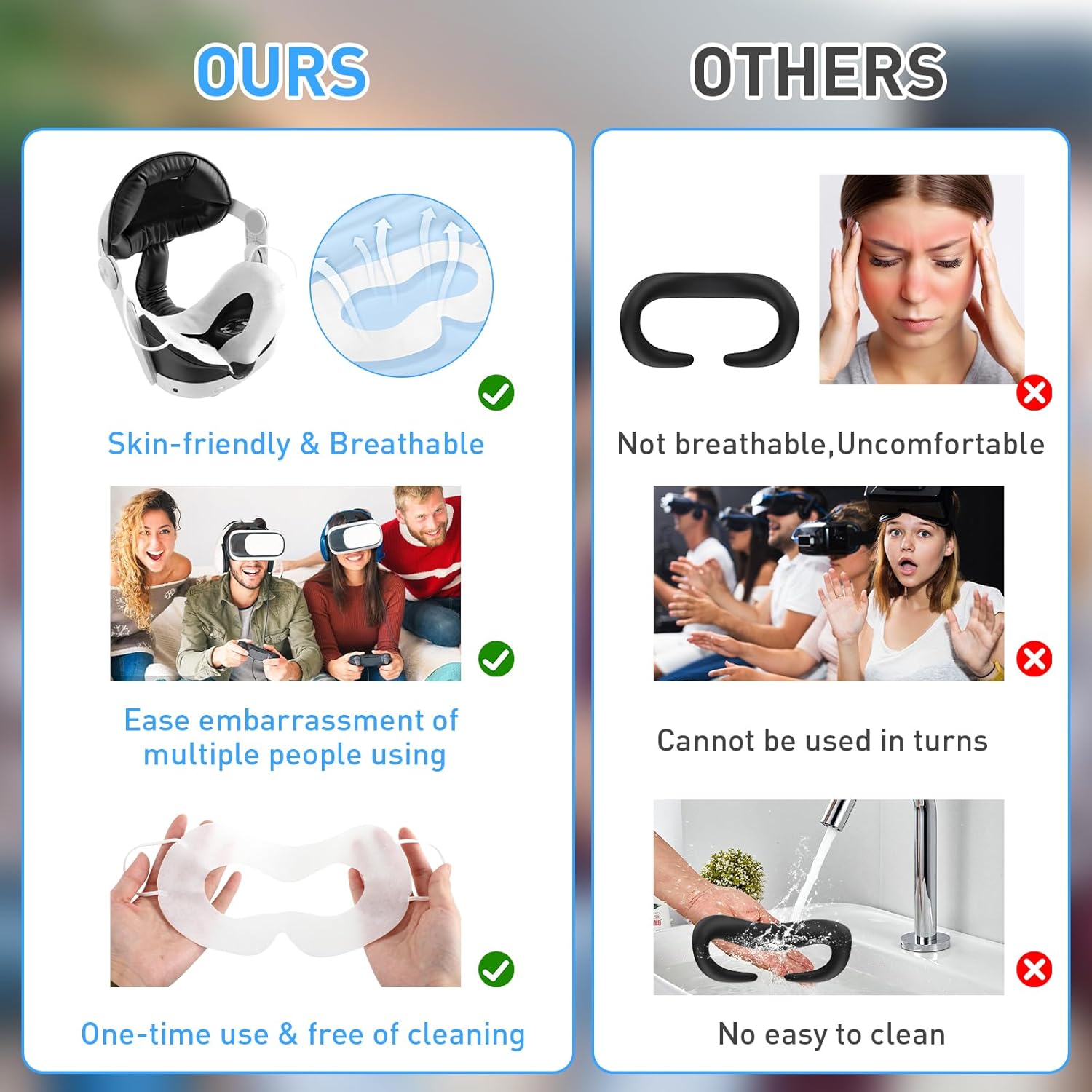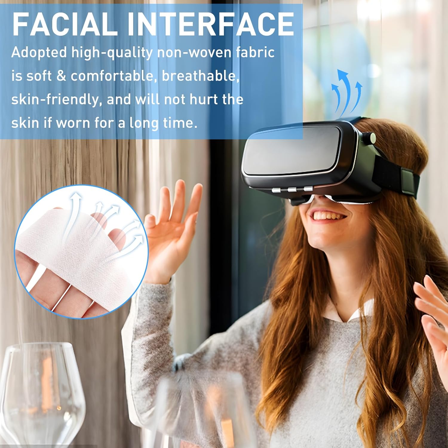 ✅ أقمشة فاخرة غير منسوجة – قناع الواقع الافتراضي القابل للاستعمال مرة واحدة مصنوع من قماش غير منسوج عالي الجودة للاستعمال مرة واحدة وناعم ولطيف على البشرة. تتميز بمسامات للتهوية ولا تسبب تهيج للجلد عند الاستخدام طويل الأمد، وتوفر ملاءمة مريحة لألعاب الواقع الافتراضي الغامرة.