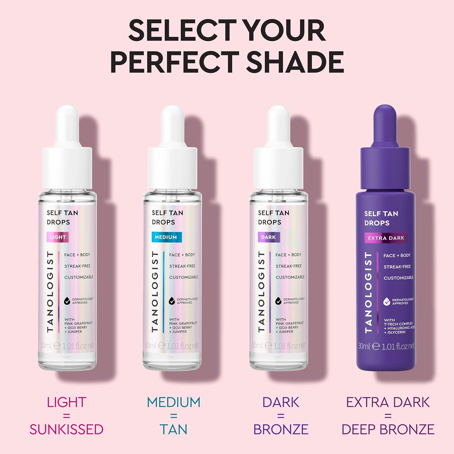 تانلوجست قطرات التسمير الذاتي مثالية لتسمير الوجه والجسم، مما يوفر تسمير قابل للتخصيص وخالي من الخطوط بدون رائحة التسمير المزيفة. احصلي على اللون المثالي بدون فوضى