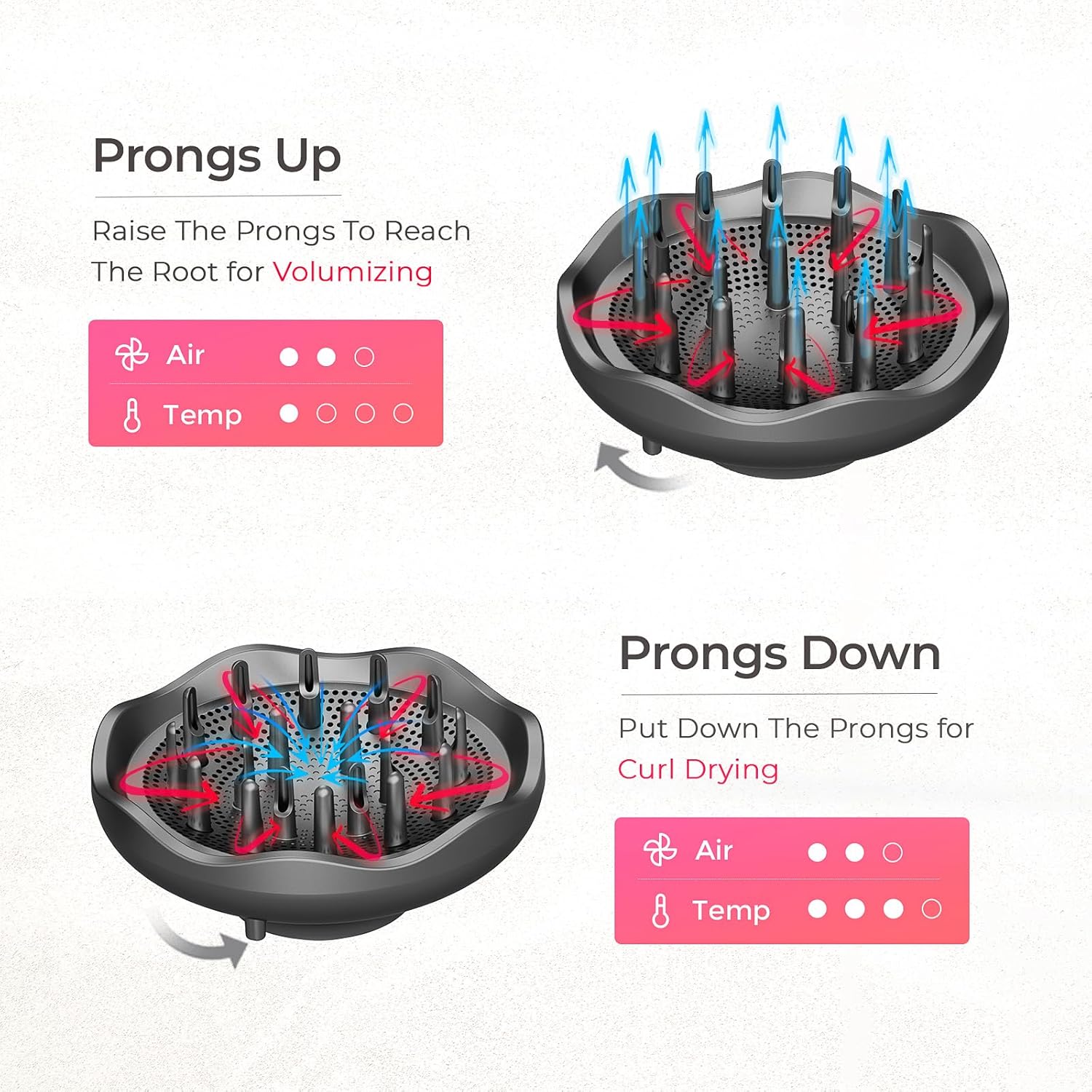 معزز لتجفيف التجعيد: من خلال وضع الشوكات لأسفل، يوفر هذا الموزع تجفيفًا مثاليًا لتجعيد الشعر مع تقليل التجعد وتعزيز التحديد للحصول على مظهر طبيعي جميل.