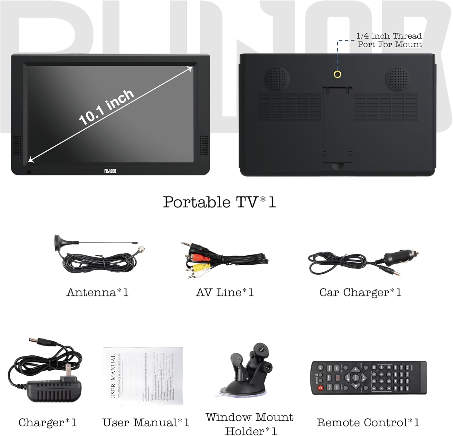 العبوة: تلفزيون محمول 10 بوصة × 1 هوائي × 1 خط ايه في × 1 شاحن سيارة × 1 × شاحن × 1 × دليل مستخدم × 1 حامل تثبيت على النافذة × 1 × جهاز تحكم عن بعد × 1