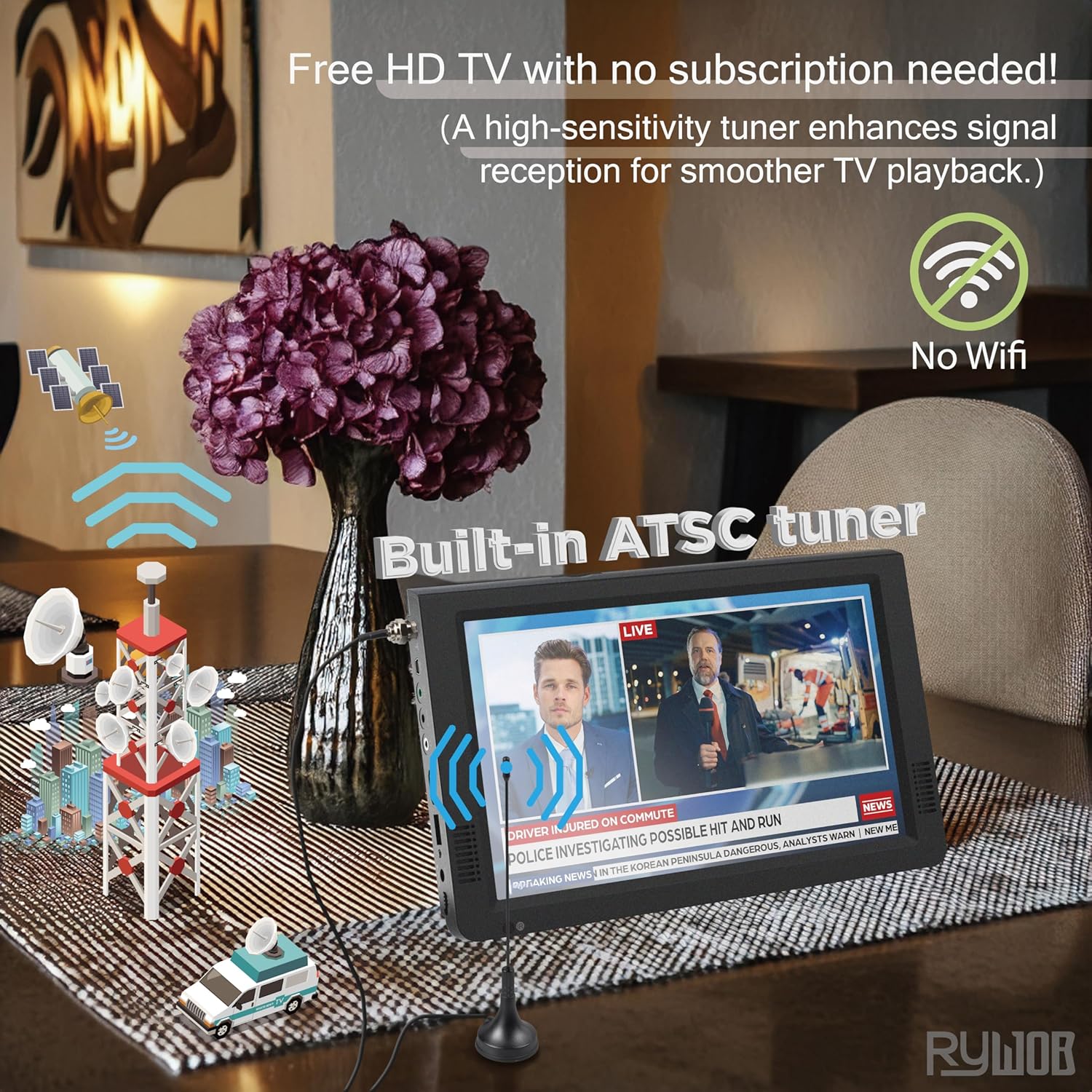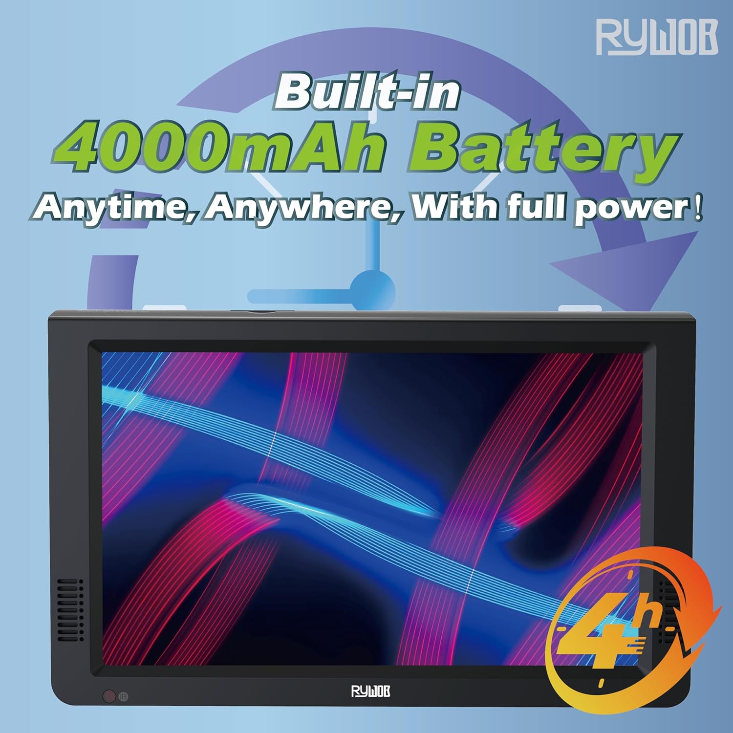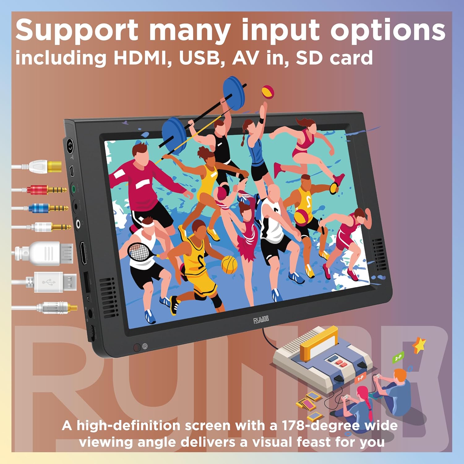 تلفزيون صغير محمول 10 بوصة من ريووب، بطارية مع ATSC/USB/بطاقة SD/HDMI/VGA/AV، شاشة LCD 1080P مع جهاز تحكم عن بعد وحامل للتخييم والسيارة والمطبخ والسفر والطوارئ