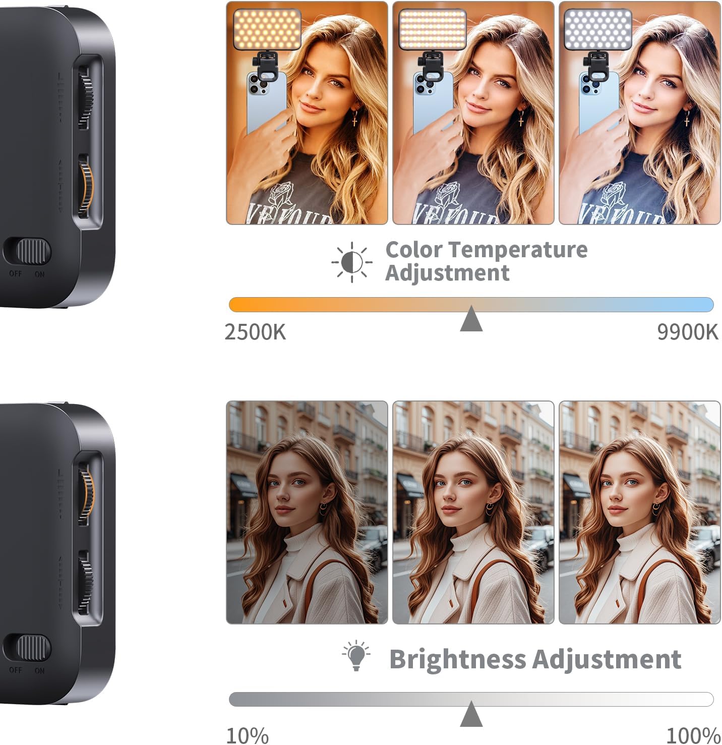 【تحكم دقيق في الإضاءة لللقطات】يتميز مصباح سيلفي تونوف للجوال بقرصين غير متدرجين لضبط درجة حرارة اللون والسطوع بشكل سلس. سواء كنت في الأماكن المغلقة في الإضاءة الدافئة أو في الهواء الطلق في ضوء النهار الطبيعي، يمكنك تخصيص الضوء بسهولة إلى إعدادك المثالي. انس العبث بالأزرار – فقط اطلبها بشكل مثالي للحصول على إضاءة مثالية لتعزيز كل لقطة