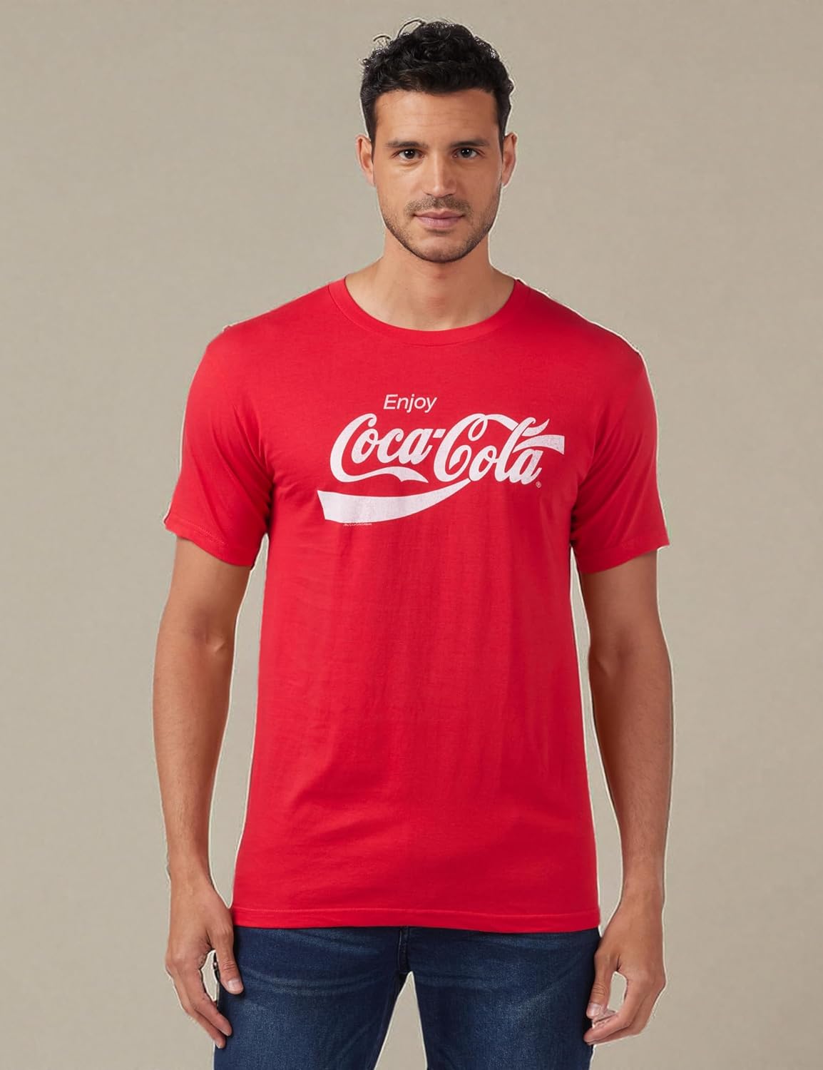 تي شيرت كوكا كولا بكم قصير ونمط الثمانينات للرجال، لون أحمر