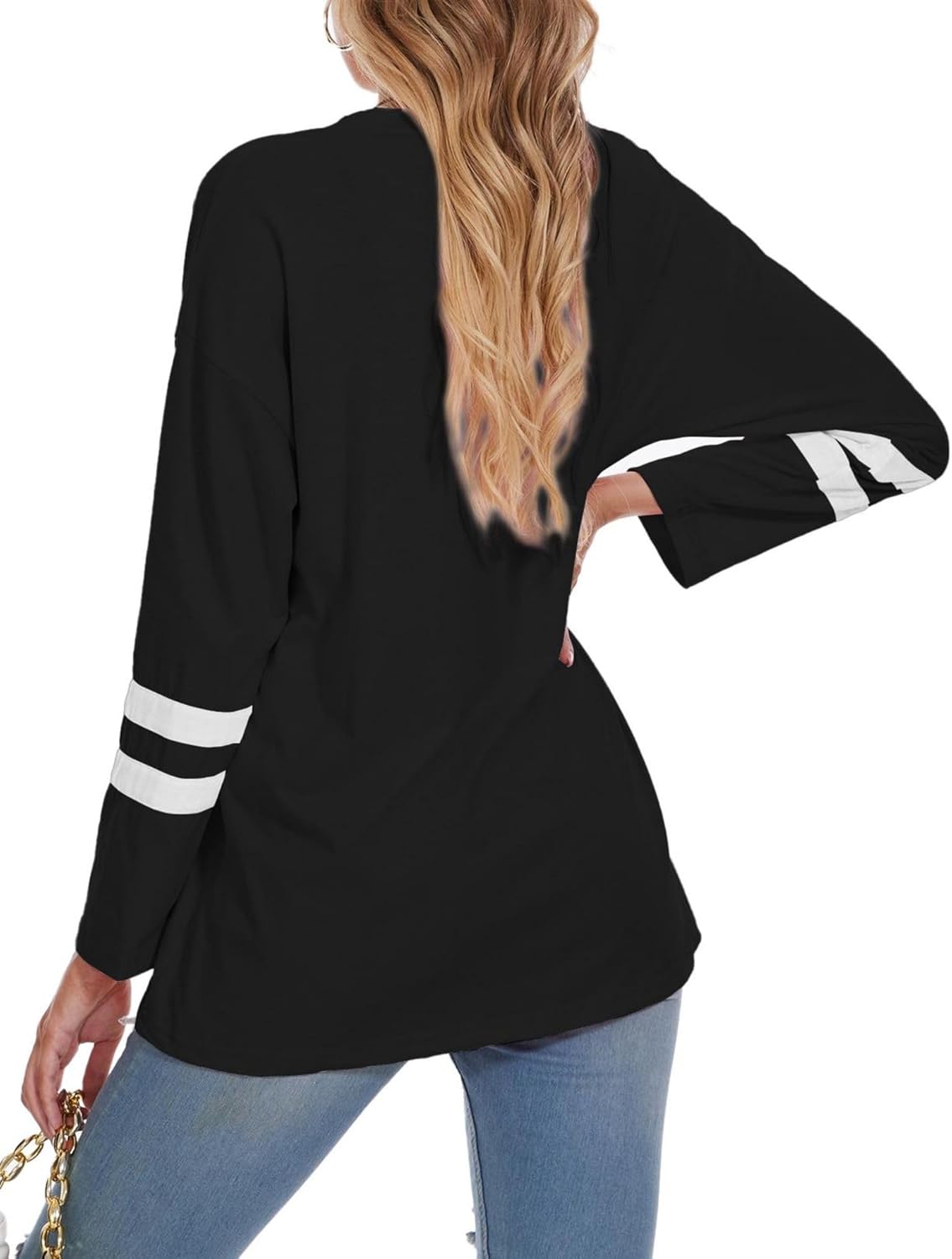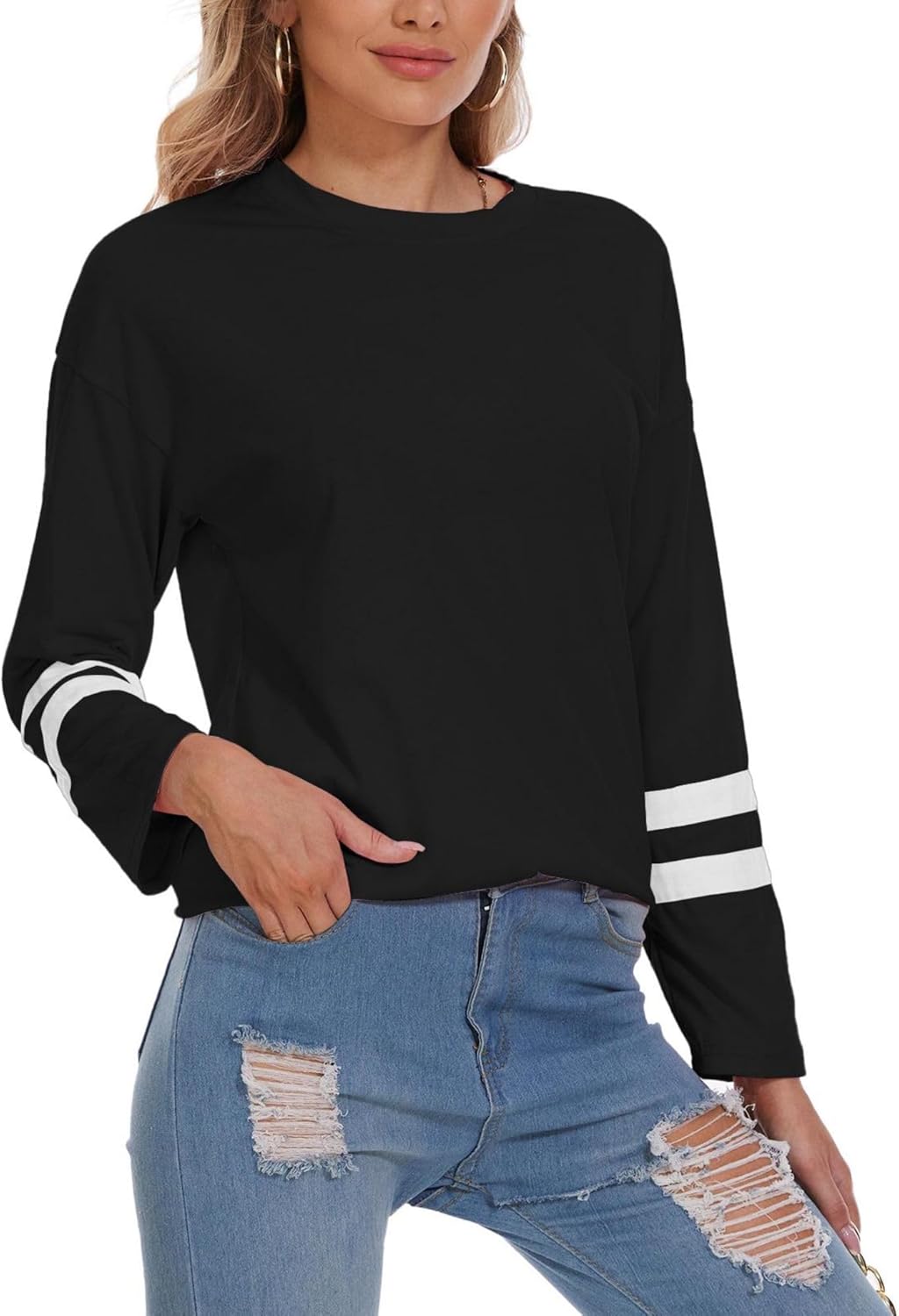 تي شيرت نسائي كبير الحجم برقبة دائرية ضيقة واكمام طويلة 2024 مريح من القطن المريح باللون الاسود مقاس M