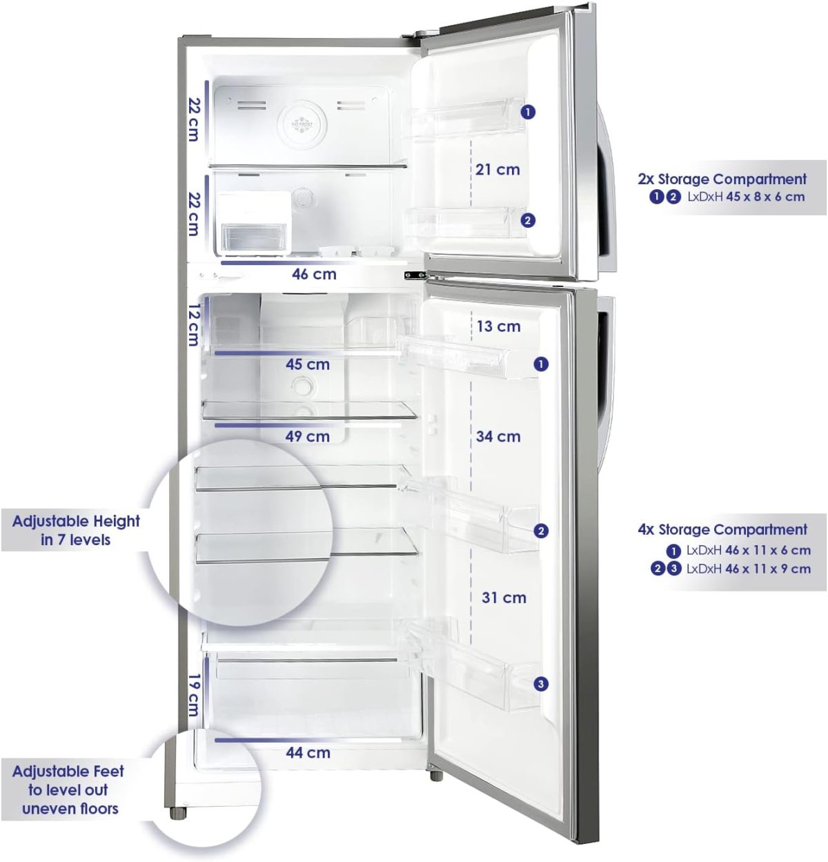 جميع الأرفف قابلة للتعديل في الارتفاع، ما يسهل عليك تخزين الأشياء الأكبر حجمًا مثل الكيك أو المشويات. بفضل مساحات التخزين الموجودة في الباب، يتم أيضًا تخزين الزجاجات الكبيرة وأباريق الحليب أو العصير أو مخفوق البروتين أو الصودا أو الماء بسهولة.