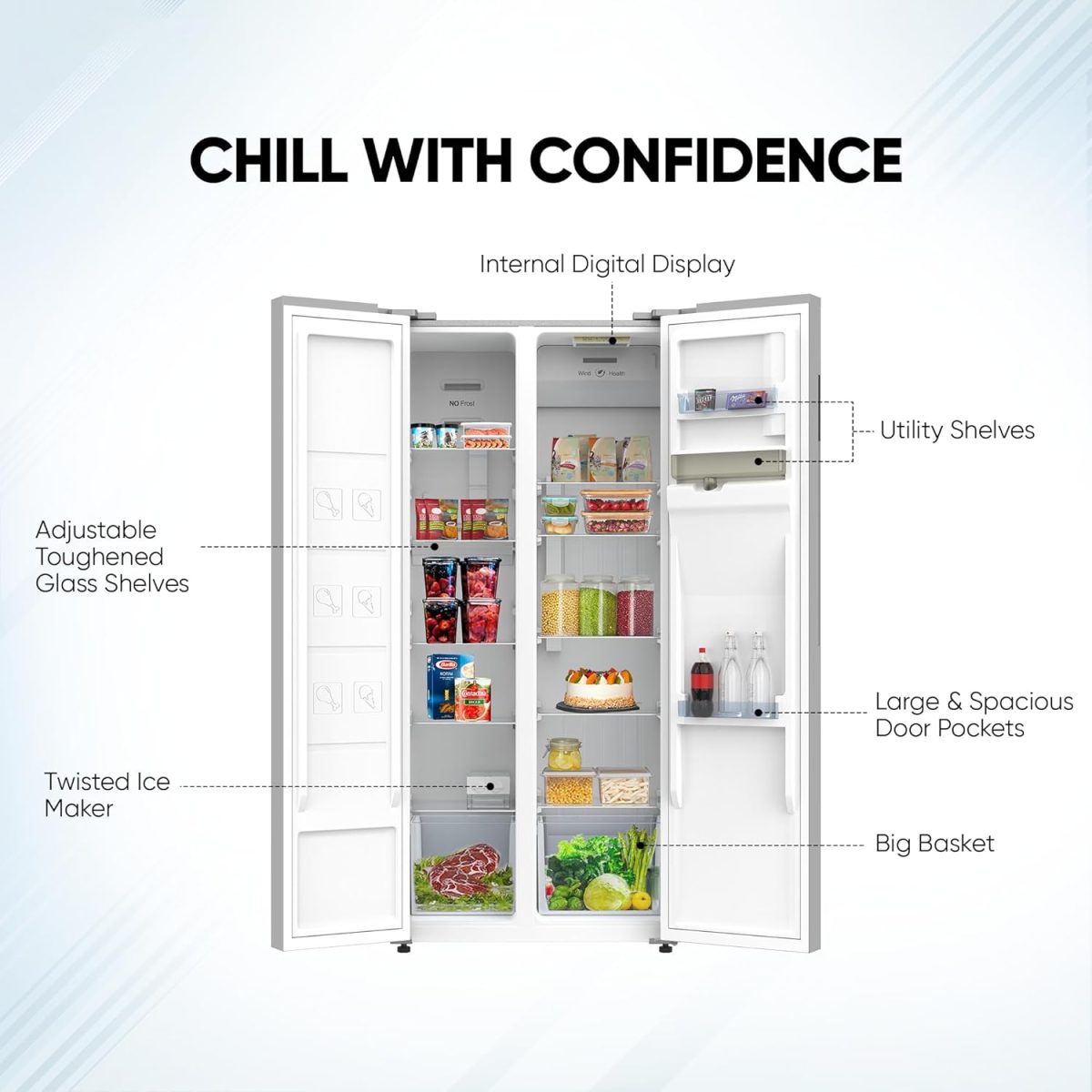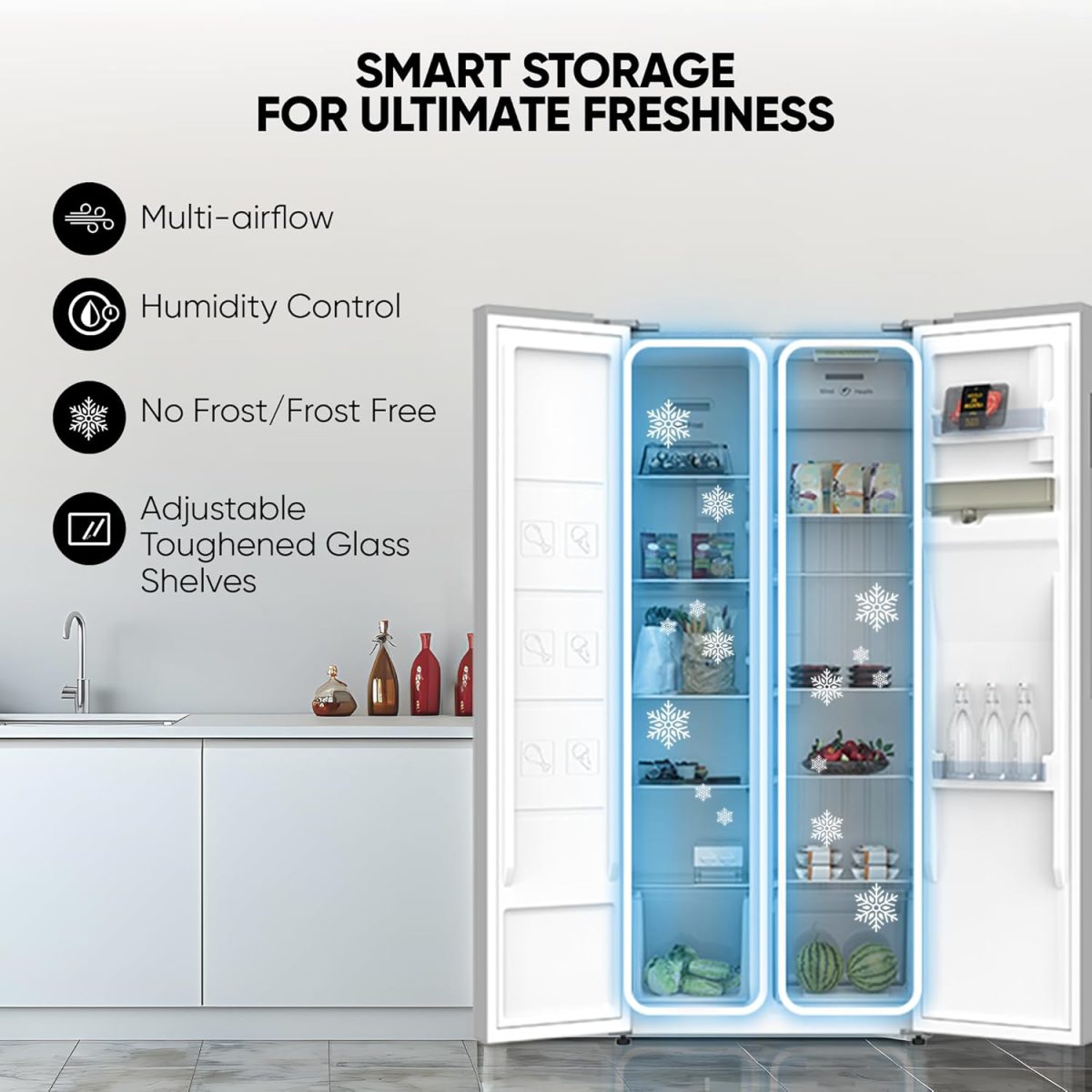 مساحة تخزين واسعة: مع مساحة تخزين واسعة، تستوعب ثلاجة نيكاي جنبًا إلى جنب البقالة والمشروبات وبقايا الطعام بسهولة. تصميمه الداخلي المصمم جيدًا يزيد من استخدام المساحة وتنظيمها. توفر هذه الثلاجة سعة تخزين كبيرة دون التنازل عن كفاءة الطاقة، مما يجعلها خيارًا عمليًا للأسر التي تتطلب مساحة واسعة وأرفف زجاجية صلبة قابلة للتعديل لسهولة تخزين الطعام والبقالة.