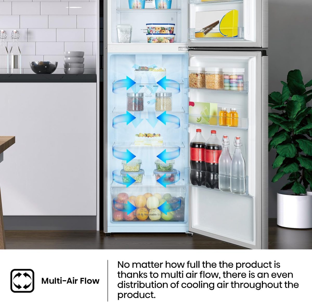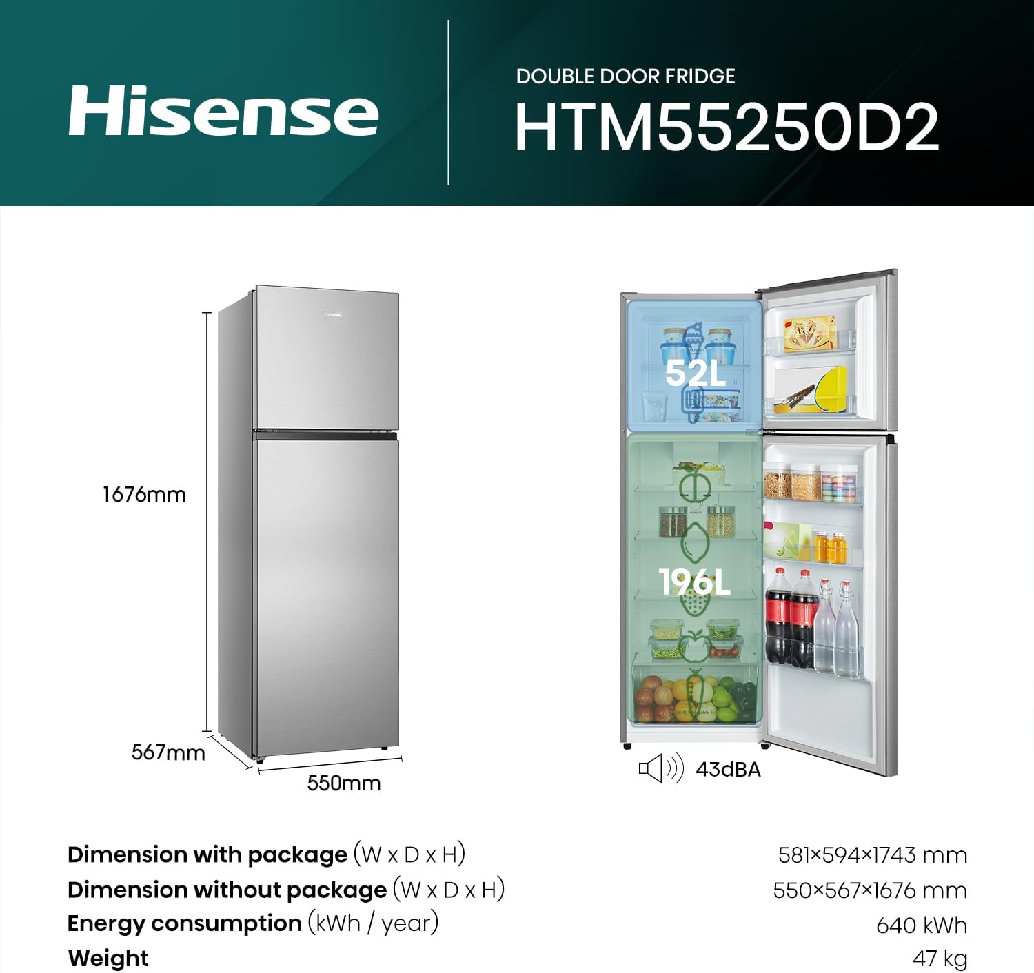 ثلاجة Hisense HTM55250D2 من هايسنس، 328 لتر، تقنية نو فروست، باب شرفة، باب كبير، بدون تجميد، ضوء داخلي LED، فلتر مزيل للروائح، تدفق هواء متعدد، تصميم باب 90 درجة، فضي، ضمان لمدة عام