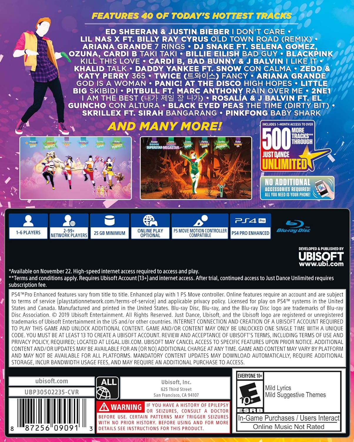 جاست دانس 2020 هي لعبة الرقص المثالية، مع 40 مسار ساخن من أعلى مستوى من الصور مثل “الرجل السيئ” بواسطة بيلي إيليش، “كيل ذيذ لوف” من بلاكبينك “أولد تاون رود (ريميكس) بواسطة ليل ناس إكس فت. بيلي راي سايروس و7 حلقات” من أريانا غراند، والأغنية الجديدة “إنتو ذا غير معروف” من ديزني فروزن. استمر في الحفلة لساعات مع الأغاني لكي تستمتع جميع أفراد الأسرة!