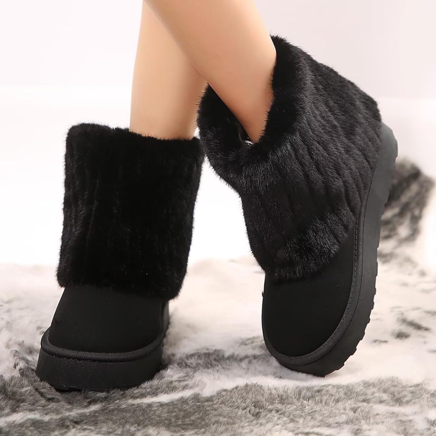 جزمة شتوية شتوية دافئة من الفرو الصناعي للنساء مع بطانة من الفرو ونعل غير قابل للانزلاق