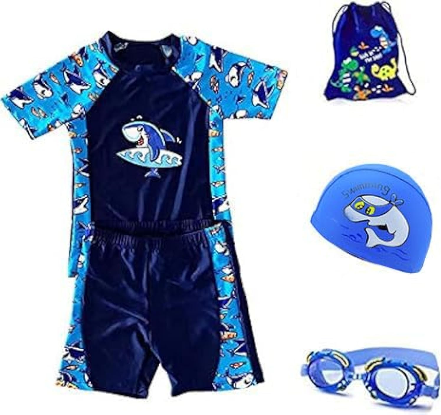 طقم ملابس سباحة للأولاد مكون من قطعتين مع قبعة سباحة ونظارات وحقيبة تخزين 4 في 1 لأدوات السباحة متينة ومرنة: قماش مقاوم للكلور والملح بدرجة عالية، احتباس منخفض للماء وتجفيف سريع للغاية. ذاكرة تمدد أربعة اتجاهات.