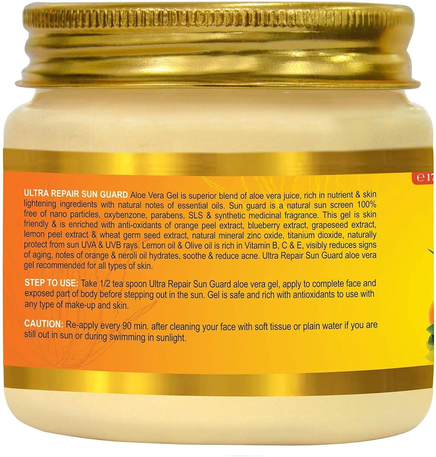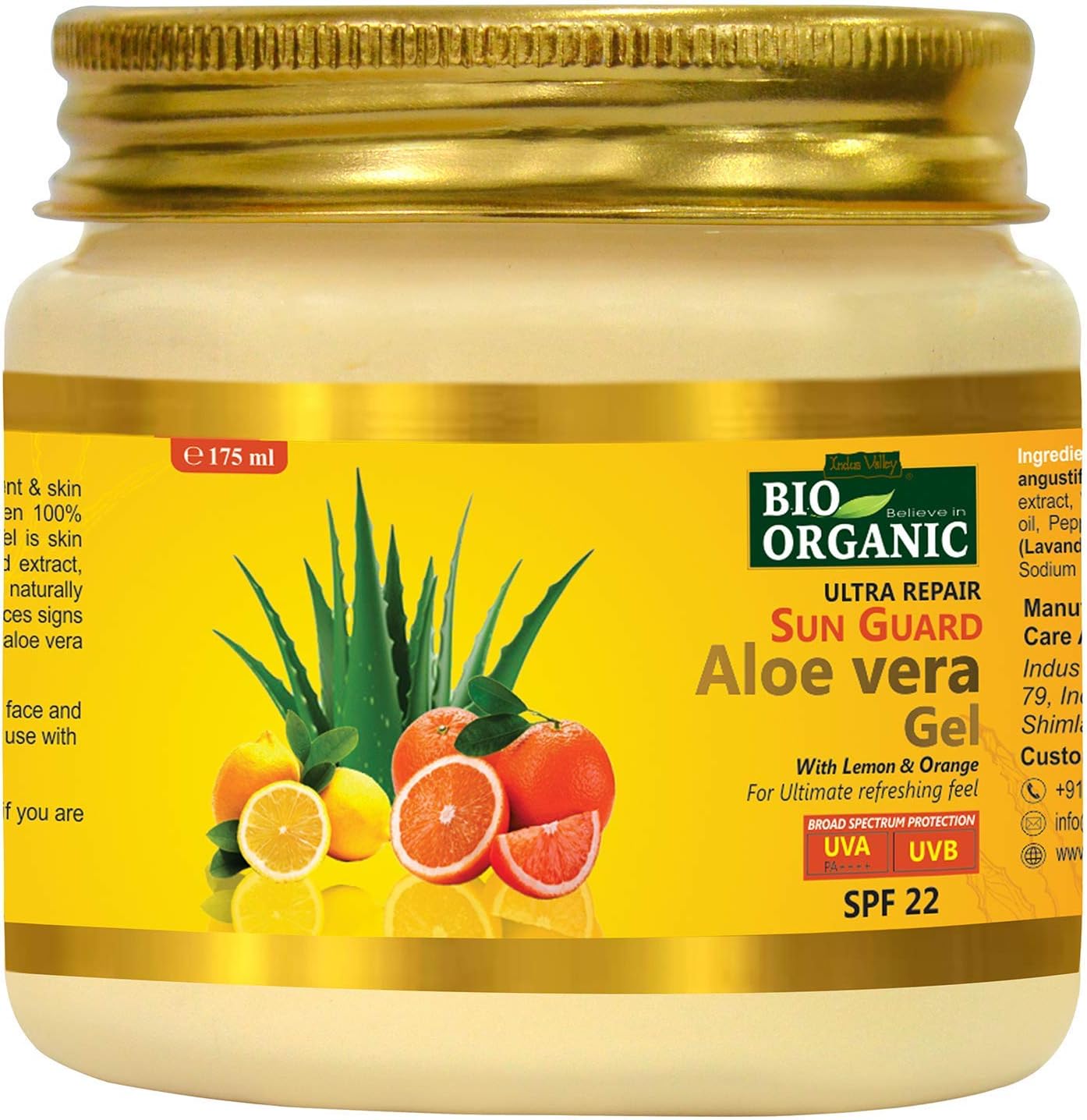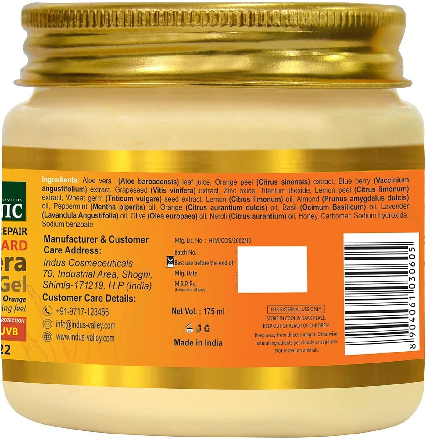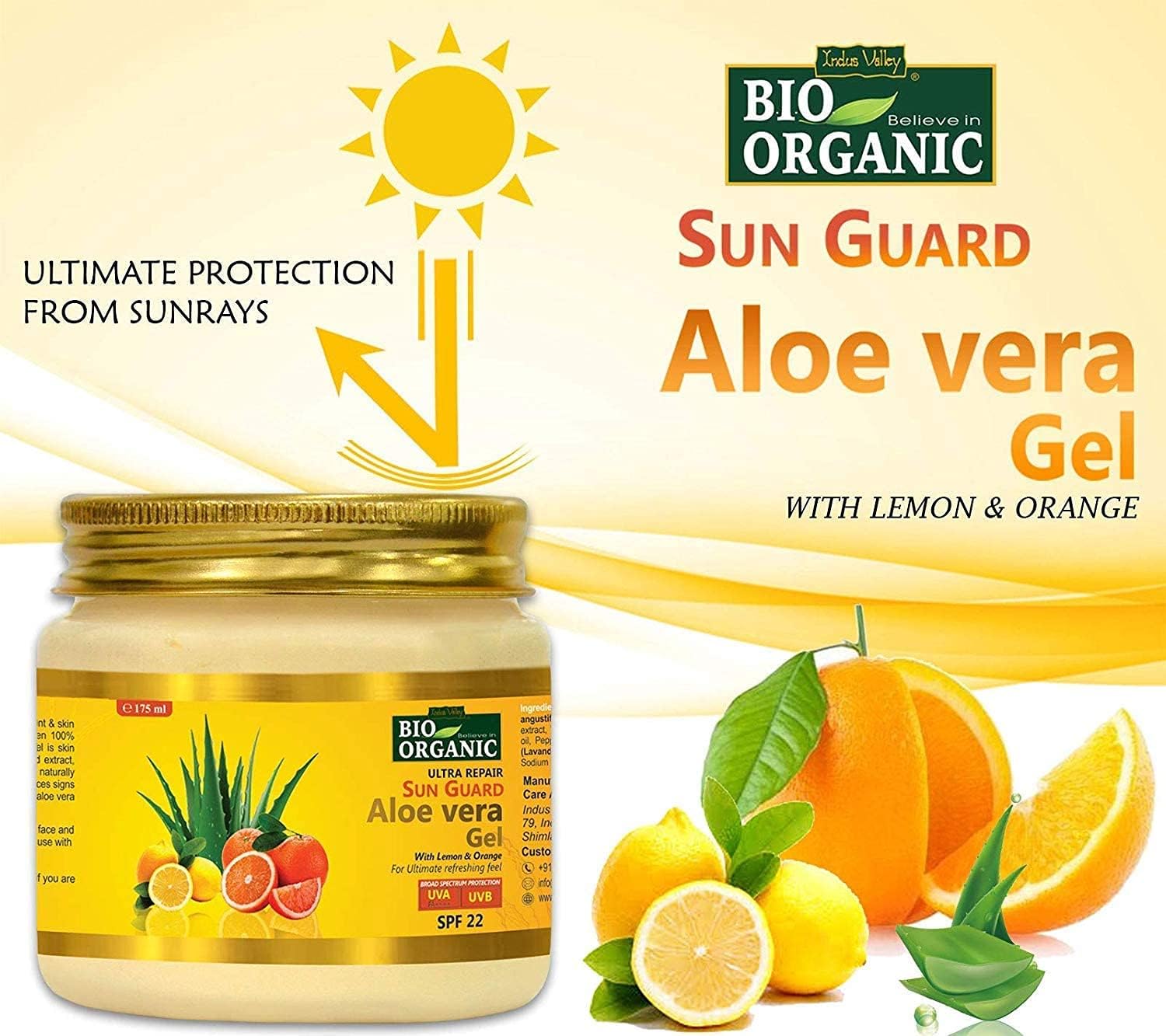Indus Valley Bio Organic Ultra Repair Sun Guard Aloe Vera Gel is a superior mix of aloe vera juice, wealthy in supplement and skin lightening ingredients with regular notes of essential oils. This gel is skin-friendly and is improved with hostile to oxidants of orange peel extract, blueberry extract, grape seed separate, lemon peel separate and wheat germ seed extract that secure from sun UVA and UVB rays. Indus Valley Bio-Organic Sun Guard Aloe Vera Gel is a pure blend of fresh aloe vera gel with suspended sunscreen agents and finalized in a non-oily creamy. Lemon oil is rich in Vitamin B, C & E, visibly reduce signs of aging, notes of orange & neroli oil hydrates, soothe & reduce acne. Sun guard aloe vera gel is recommended for all types of skin.