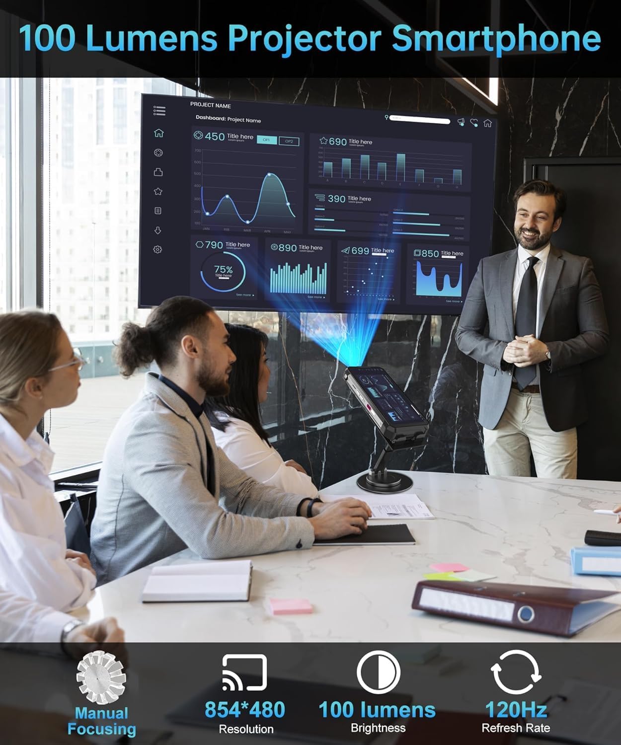 المزايا: وحدة المعالجة المركزية–بطارية هيليو G99 –23800mAh RAM+ROM –24GB (12GB + 12GB RAM افتراضية) + 512GB / يدعم بطاقة TF 1TB بحد أقصى 100 لومن 120Hz جهاز عرض DLP / ضوء LED خارجي وضوء أحمر أزرق شاشة اندرويد 14.0 –6.75 بوصة FHD+1080*2460 1 معدل تحديث 20 هرتز أخرى — بلوتوث 5.3، نظام تحديد المواقع+GLONASS+Beidou+Galileo(GPSL1+L5) الكاميرا الأمامية–كاميرا خلفية 32 ميجابكسل FF — كاميرا 100 ميجابكسل/كاميرا رؤية ليلية 64 ميجابكسل–IP68/GMS/FCC/CE/MIC/IC الحجم: 179*86*31 ملم، وزن الهاتف الذكي: 688 جرام