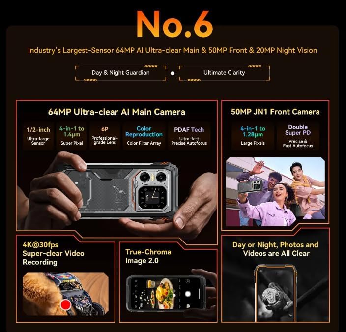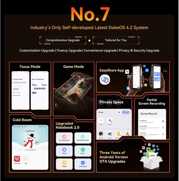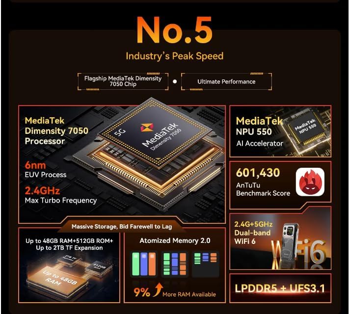 وصف الموديل: اكسبلور 1 وحدة المعالجة المركزية: ثماني النواة 5G ميديا تيك ديمنستي 7050، 6 نانومتر، حتى 2.4 جيجاهرتز، الأبعاد: 184*83*29.5 ملم، الوزن الصافي: 638 جرام، نظام التشغيل: اندرويد 15.0 الشاشة: 6.75 انش 2.4K FHD+IPS، دقة 1080*2460، زجاج غوريلا 5,120معدل تحديث هرتز، الشاشة الثانوية: 2 بوصة، دقة 240*296، ذاكرة رام وروم: ذاكرة رام 16 جيجابايت وروم 512 جيجابايت، LPDDR5+UFS3.1 توسيع TF: حتى 2 تيرابايت كاميرا خلفية: 64 ميجابكسل رئيسية+كاميرا أمامية للرؤية الليلية 20 ميجابكسل: 50 ميجابكسل (ايزو JN1) البطارية: 20 ميجابكسل بطارية بطارية 0000mAh بطارية ؛ فتحة بطاقة الشحن السريع 55 واط: 2 × شريحة اتصال نانو/ 1 × شريحة اتصال + 1 × بطاقة تي اف تصنيف قوي: IP68 & IP69K & MIL-STD-810H دعم الملاحة: GPS/GLONASS/BeiDou/Galileoميزات أخرى: OTG، FM، بصمة الإصبع، NFC، AI واي فاي وبلوتوث: IEEE802.11a/b/g/n/ac/ax(2 .4GHz/5GHz)؛ شبكة بلوتوث 5.2: 5G النطاق: N1/3/5/7/8/20/28/38/40/41/77/78 نطاق 4G: TDD: B34/B38/B39/B40/B41، FDD:B1/B2/B3/B4/B5/B7 /B8/B12/B13/B17/B18/B19/B20/B25/B26/B28A/B28B/B30/B66 3G النطاق: WCDMA: B1/B2/B4/B5/B6/B8/B19; CDMA:BC0/BC1/BC10 الفرقة 2G: B2/B3/B5/B8
