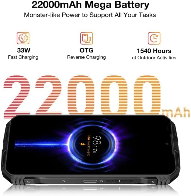 هاتف دوجي في ماكس بلس الجيل الخامس 5G المتين يتميز ببطارية ضخمة بسعة 22000 مللي امبير في الساعة، مما يوفر ما يصل إلى 2350 ساعة من وقت الاستعداد. مع الشحن السريع 33 واط، احصل على 80% من الطاقة في ساعة واحدة فقط. استمتع بـ 130 ساعة من المكالمات و130 ساعة من الموسيقى و38 ساعة من الفيديو عند الشحن الكامل. بالإضافة إلى ذلك، تسمح وظيفة او تي جي بالعمل كباور بانك لشحن الأجهزة الأخرى.