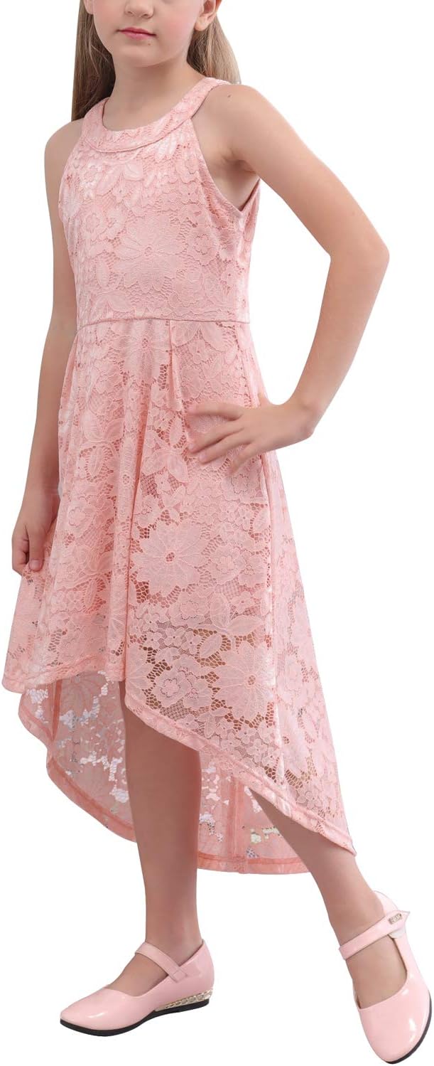 Gorlya Girl’s Halter Neck Sleeveless Cold shoulder Elegant Floral Lace Birthday Party & Wedding Flower Girl Princess Hi-Lo Dress for 4-14 Years Kids