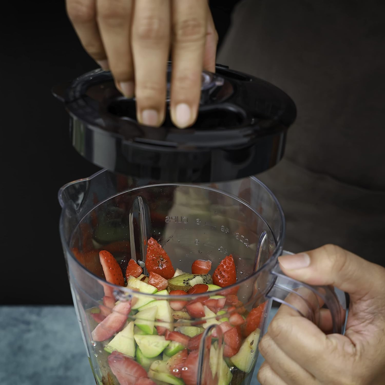 سعة البرطمان البلاستيكي 1.5 لتر – مع هذا البرطمان الكبير يمكنك مزج كميات كبيرة من الفواكه والخضروات والقهوة والتوابل. يساعد على توفير الوقت في تقطيع الفواكه أو الخضروات والحصول على كوب من العصير اللذيذ والصحي على الفور في غضون ثوانٍ قليلة ويسمح بصنع كميات أكبر من الحساء أو العصائر في وقت واحد، وهو مثالي للطهي على دفعات أو تقديم الطعام للعائلة.