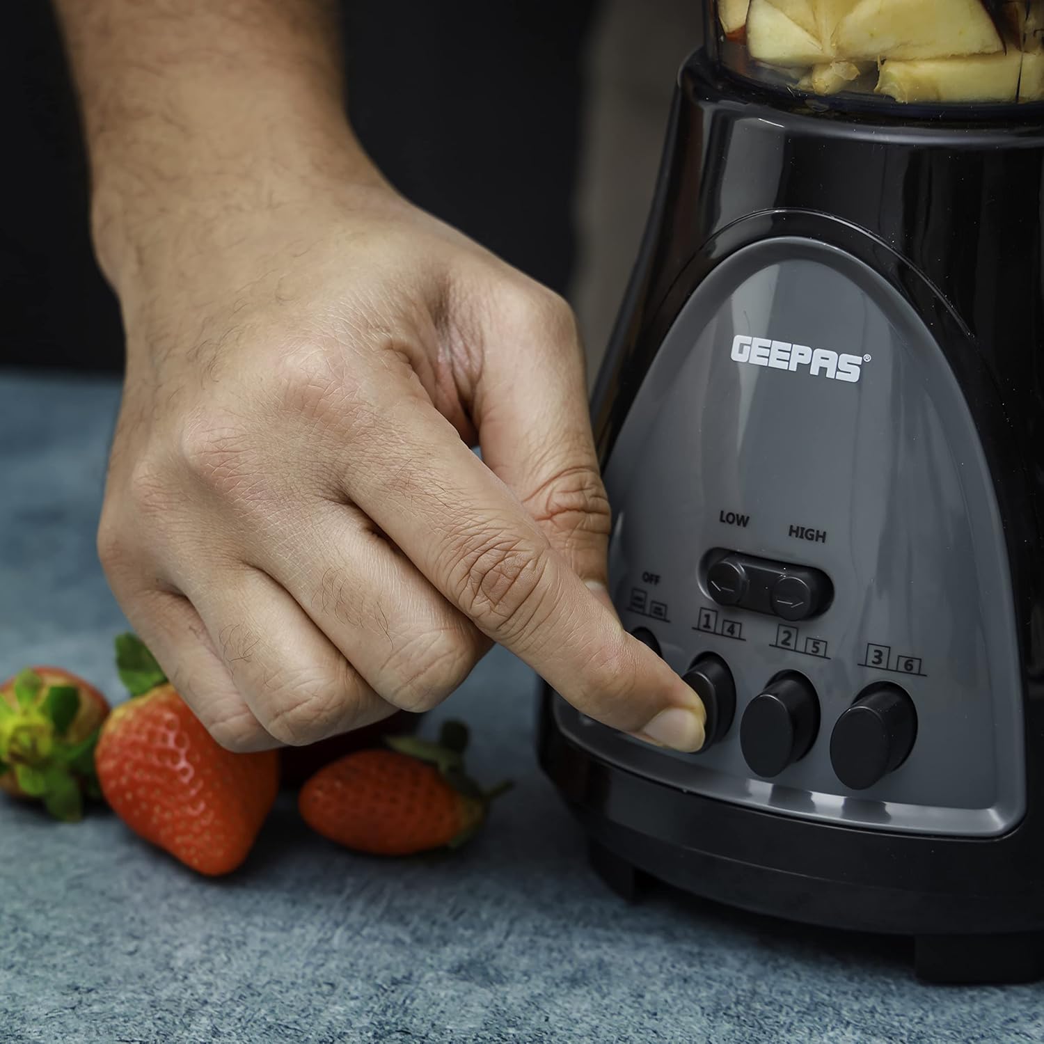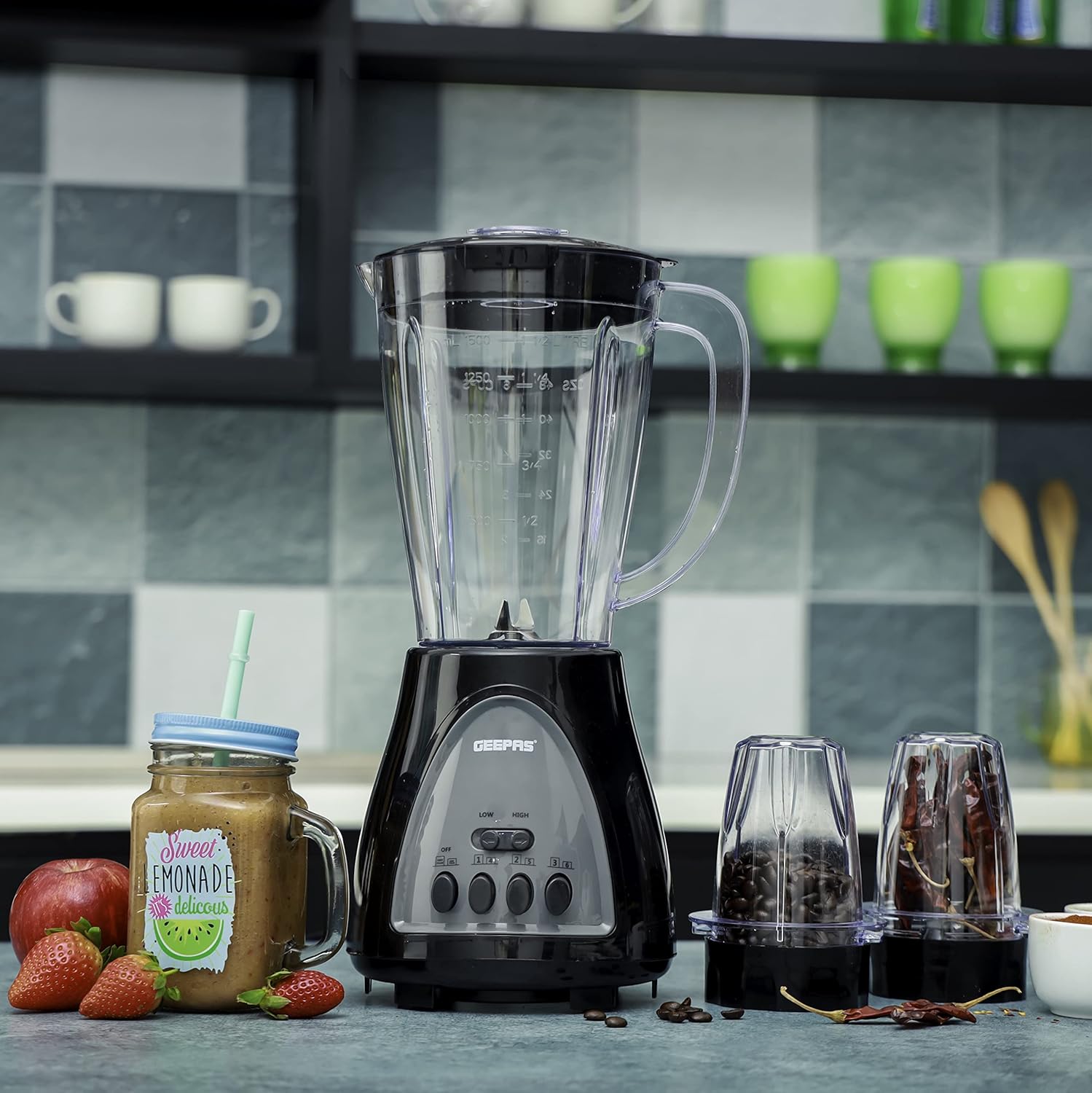 جيباس خلاط 3 في 1، محرك قوي 400 واط، شفرات تقطيع ستانلس ستيل Gsb44034 بست سرعات مع وظيفة النبض، برطمان 1.5 لتر عصارة للفواكه الكاملة والخضروات وكسارة الثلج، اسود