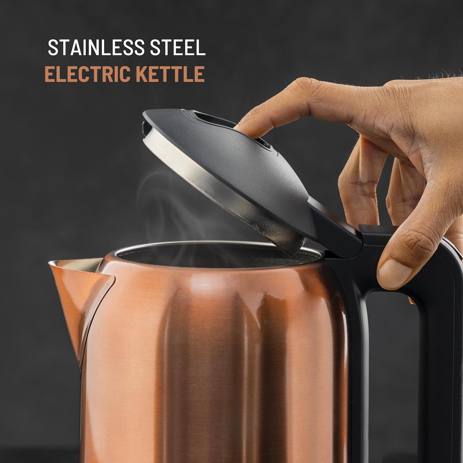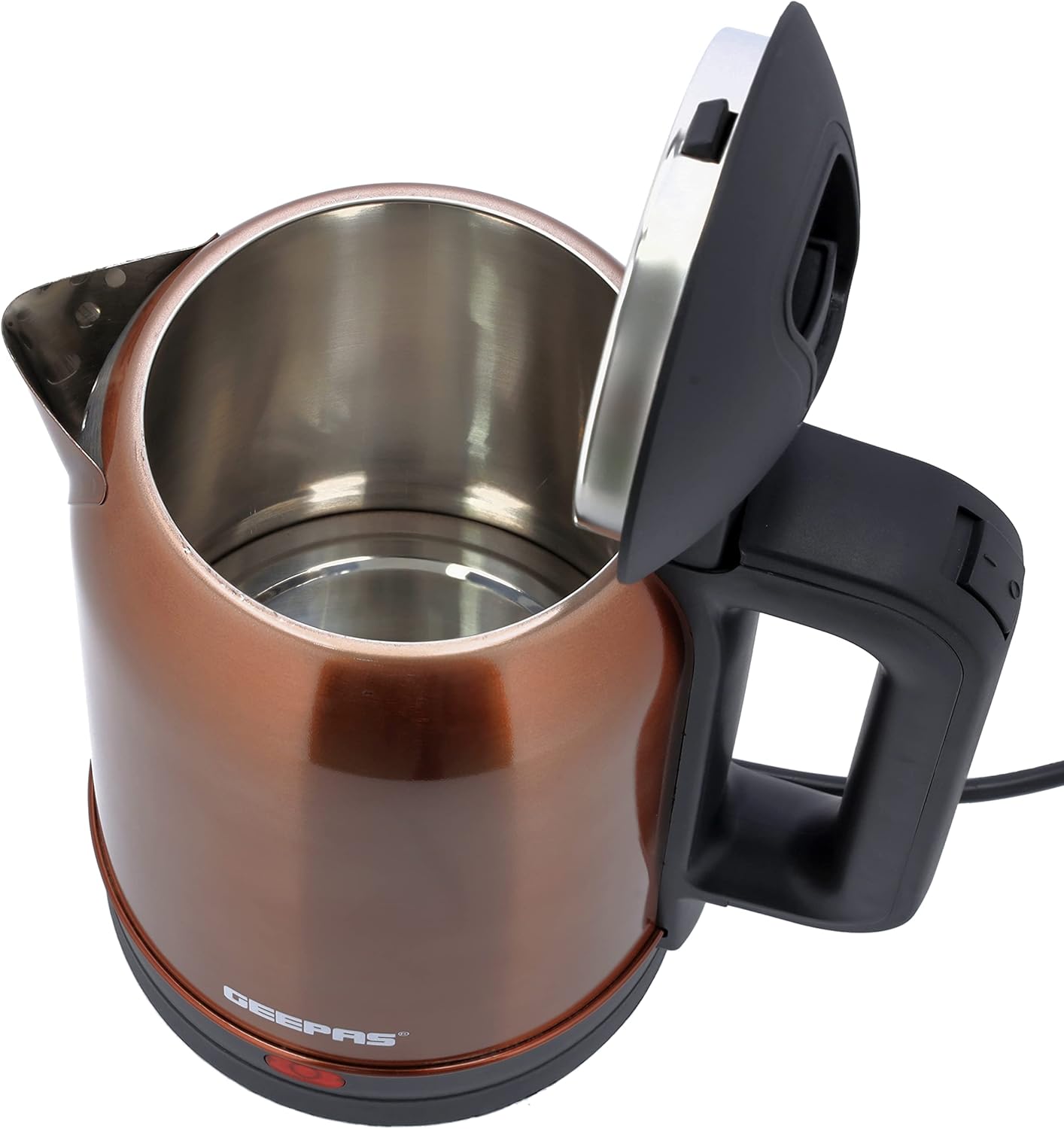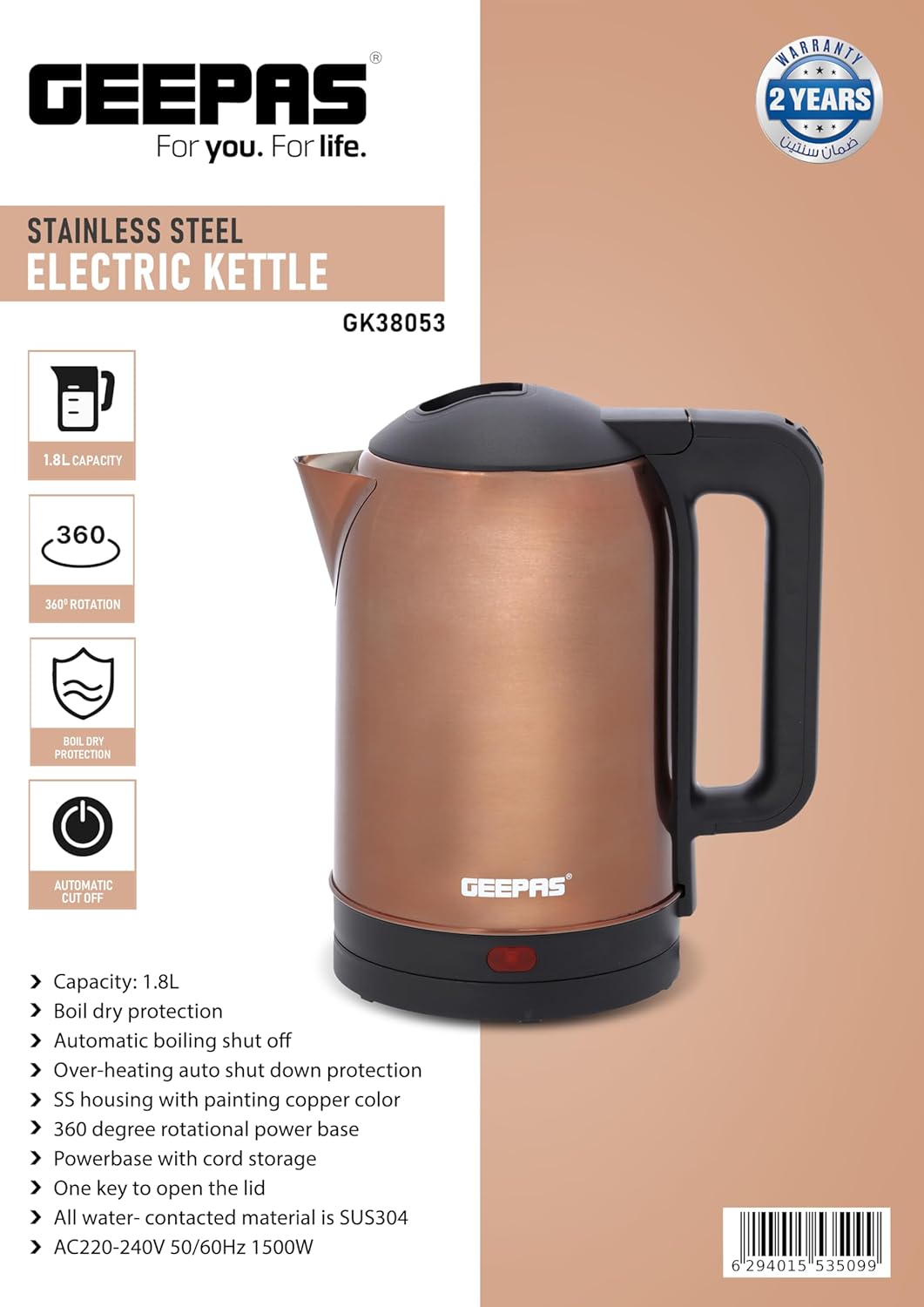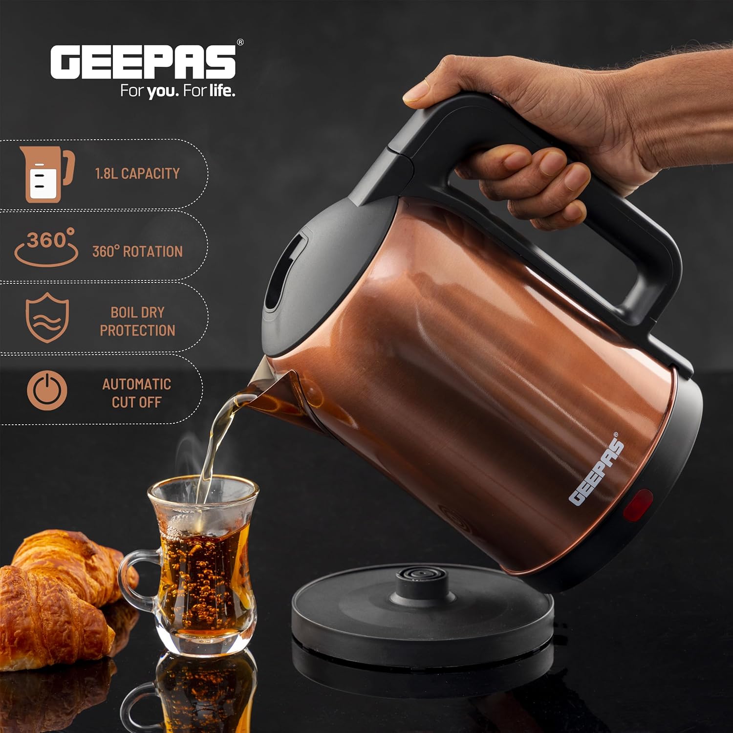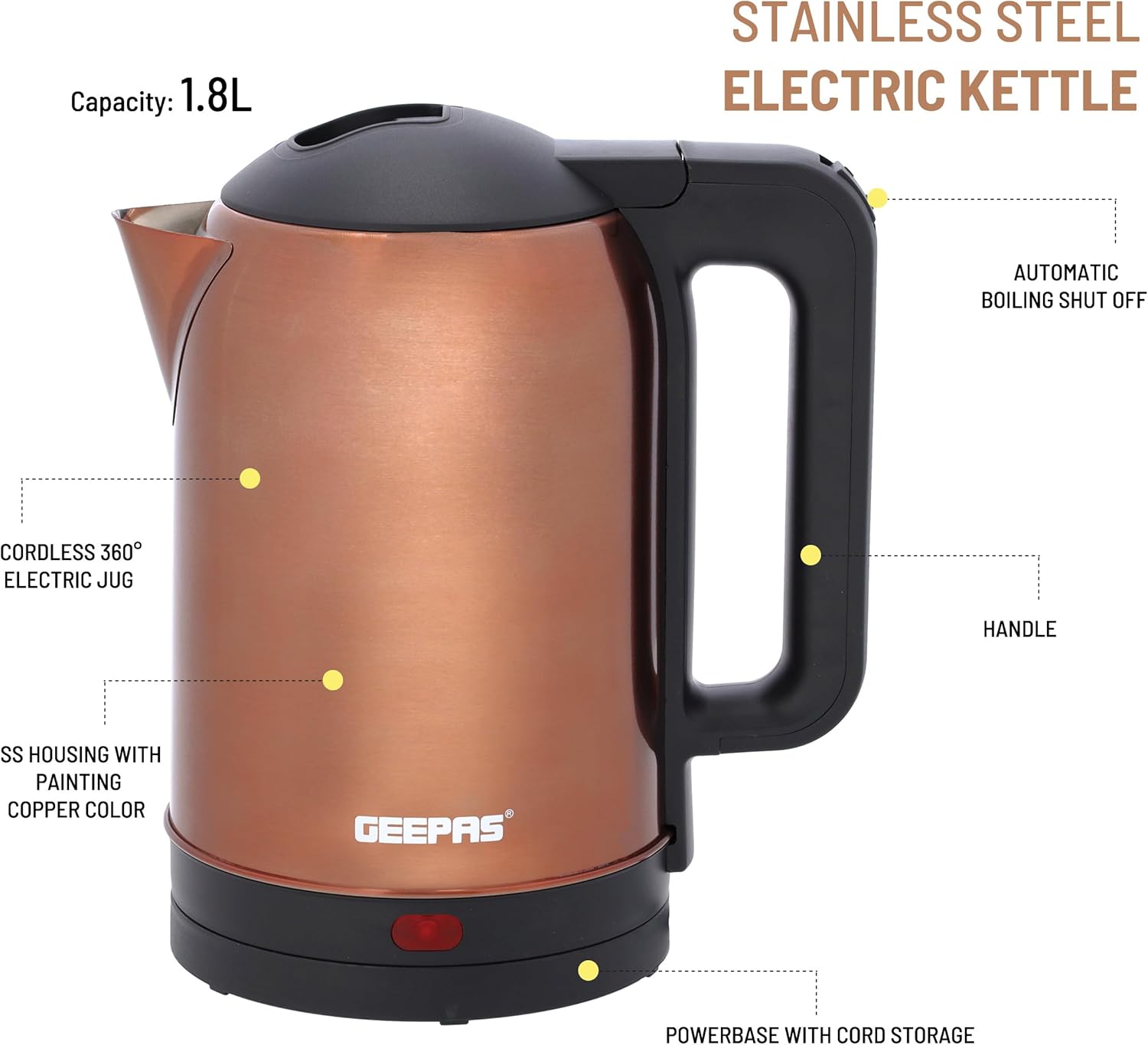 جيباس غلاية كهربائية من الستانلس ستيل بسعة 1.8 لتر – GK38053 | دوران 360 درجة، حماية من الغليان الجاف والقطع التلقائي، مثالية لغلي الماء والحليب والشاي | 1500 واط، لون نحاسي، كفالة لمدة عامين