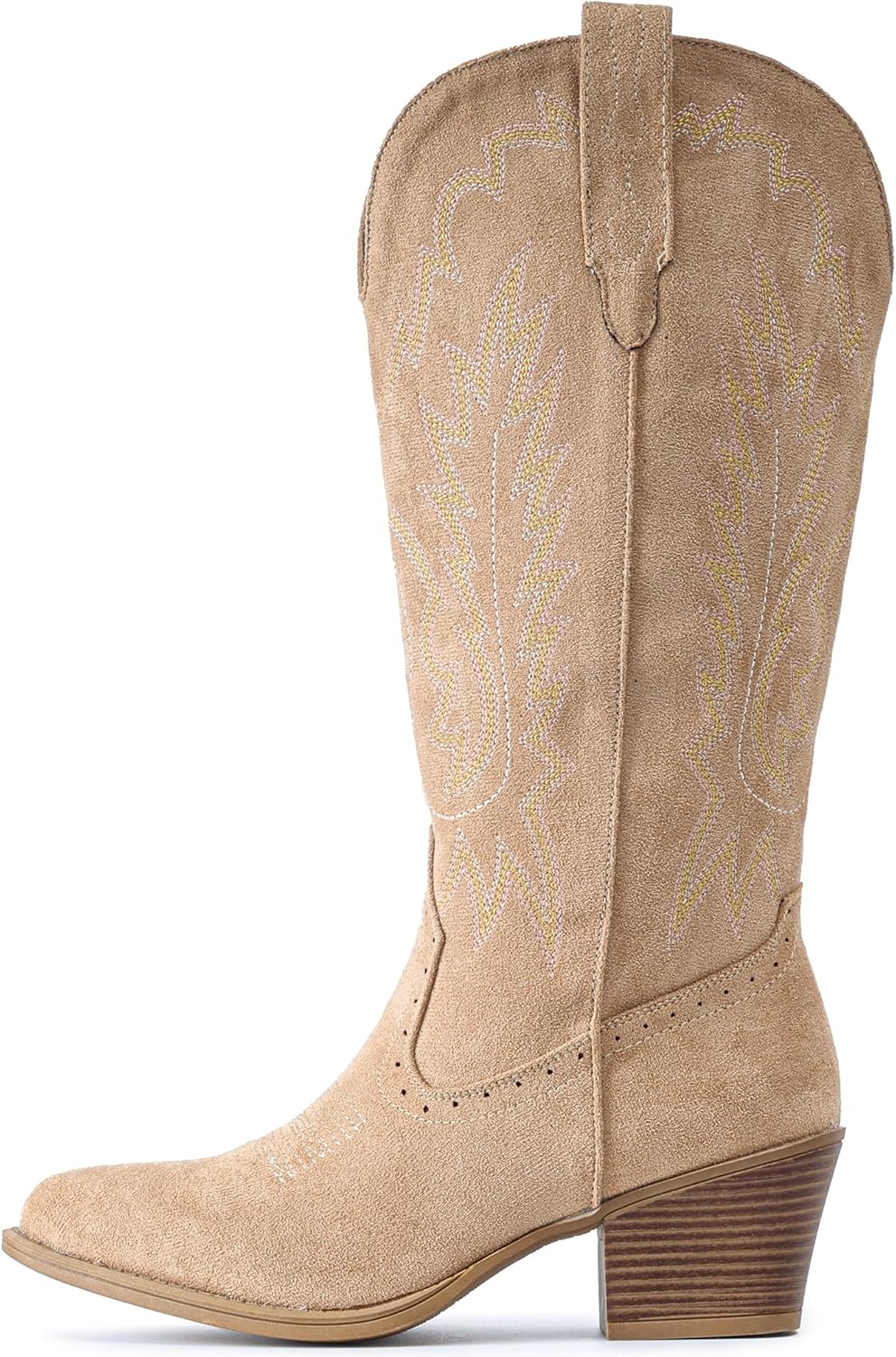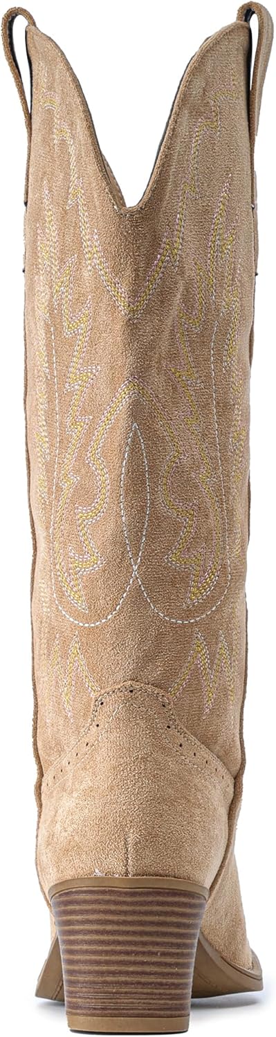 حذاء كاوبوي من الشمواه للنساء من اي يو في بكعب سميك ومقدمة مدببة، حذاء راعية البقر بطول منتصف الساق مطرز غربي للخريف